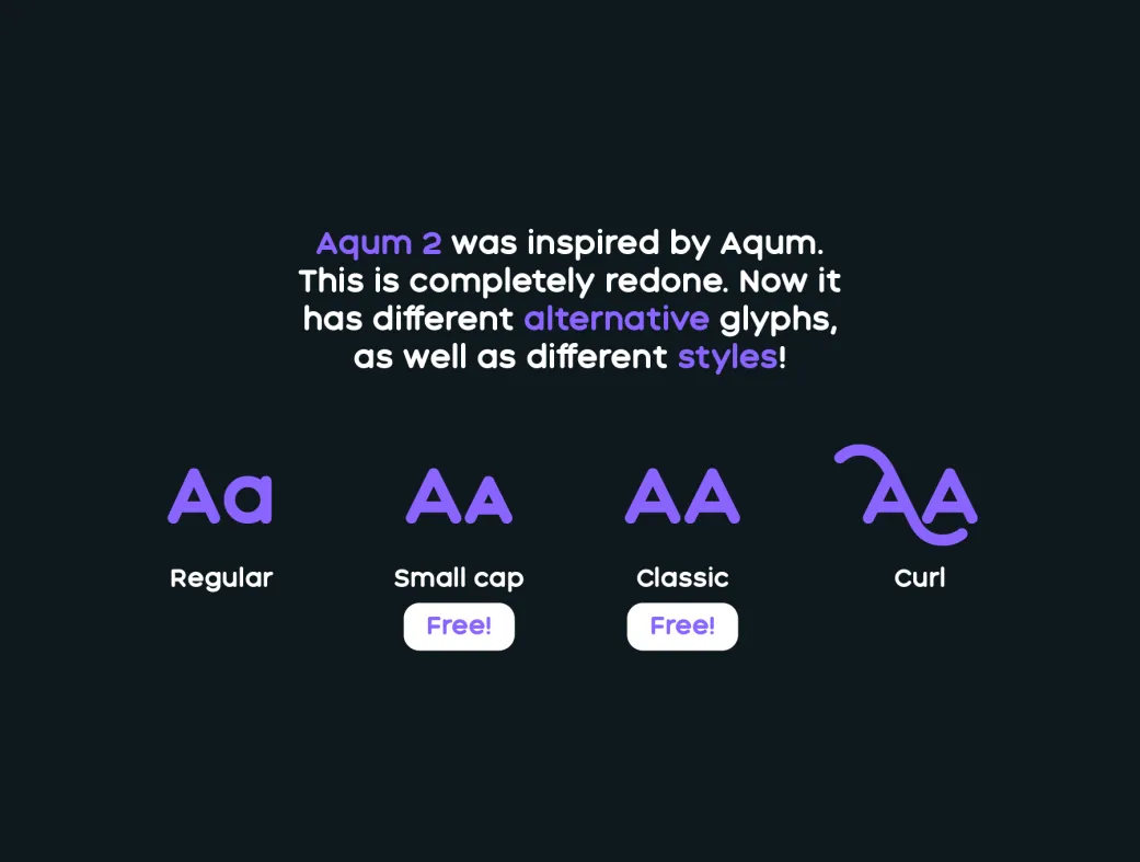فونت Aqum 2 شامل ۴ سبک متنوع است که یکی از آنها به صورت رایگان (برای استفاده شخصی و تجاری) در دسترس قرار دارد. این فونت با حروف لاتین و سیریلیک، برای ایجاد لوگوهای چشمگیر، هدرهای وبسایت و مواد چاپی مانند بروشورها و پوسترها ایدهآل است. طراحی گرد و هندسی آن، خوانایی بالا را با ظاهری مدرن ترکیب میکند و به شما کمک میکند تا در جستجوهای گوگل برای "فونت sans serif مدرن" رتبه بهتری کسب کنید.