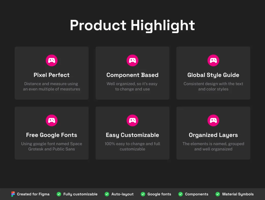کیت شامل ۵۸ صفحه کامل در حالتهای نور و تاریک است، همراه با کامپوننتهای آماده و استایلهای فیگما. فایل ZIP قابل دانلود، ساختار لایهای منظم دارد و با فونتهای گوگل و سمبلهای متریال، طراحیهای سفارشی را آسان میکند. همه اجزا کاملاً قابل ویرایش هستند تا با نیازهای پروژهتان تطبیق یابند.