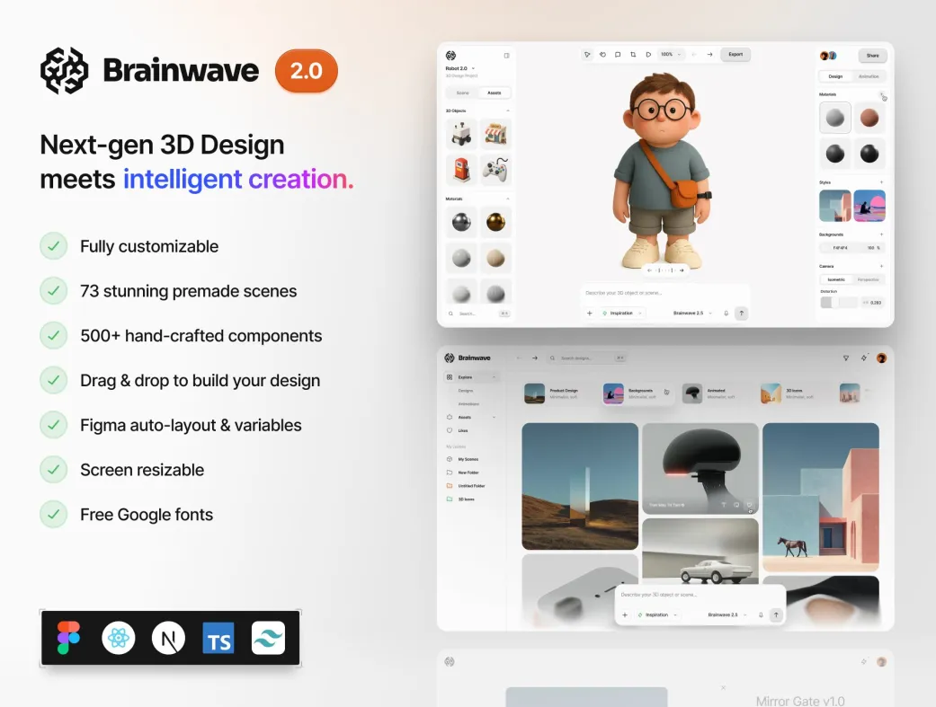 این کیت شامل بیش از 500 کامپوننت دستساز، 73 صحنه سهبعدی آماده و استایلینگ پیشرفته مواد و انیمیشن برای رابطهای نسل بعدی است. از جریان کاری درگانددراپ تا ویرایش صحنههای پویا و ابزارهای تقویتشده با AI، کیت UI Brainwave 2.0 همه چیز را برای زنده کردن پلتفرمهای خلق مدرن 3D فراهم میکند – هم از نظر بصری و هم تعاملی. با بهروزرسانیهای مادامالعمر، خیالتان از پشتیبانی بلندمدت راحت است.