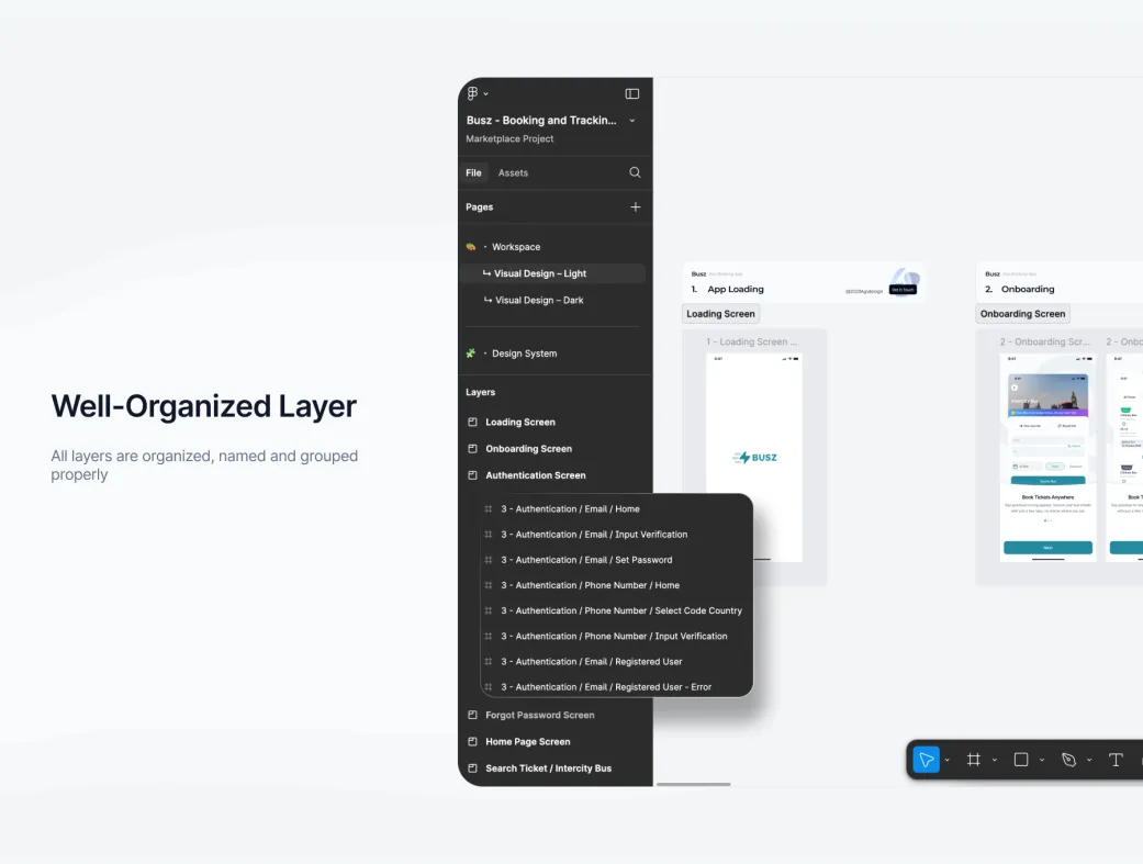 بوسز | Busz از تمام قابلیتهای پیشرفته فیگما بهره میبرد، از جمله سیستمهای طراحی، تایپوگرافی، آیکونوگرافی، چیدمان خودکار، متغیرها، کامپوننتهای پویا و واریانتها. میتوانید از سمبلهای مبتنی بر وکتور در این کیت UI استفاده کنید تا طراحی محصول خود را به راحتی بسازید. تمام سمبلها و اشیاء کاملاً قابل سفارشیسازی هستند و اپ شما را دقیقاً با هویت برندتان همخوان میکنند. این ویژگیها زمان طراحی را کاهش میدهند و کیفیت خروجی را برای پروژههای "اپلیکیشن موبایل رزرو بلیط" افزایش میدهند.