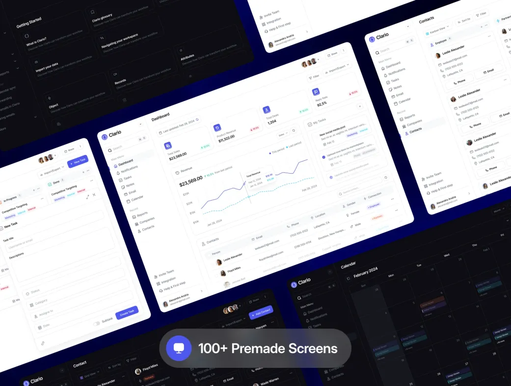 کلاریو | Clario یک کیت UI داشبورد CRM بسیار باکیفیت و دقیق است که بهطور کامل در فیگما طراحی شده. این محصول شامل بیش از ۱۰۰ صفحه حرفهای در نسخههای روشن و تیره میشود و به طراحان کمک میکند تا در کمترین زمان ممکن پنلهای مدیریتی زیبا و کاربردی برای پروژههای CRM، مدیریت فروش، بازاریابی و کسبوکار ایجاد کنند.