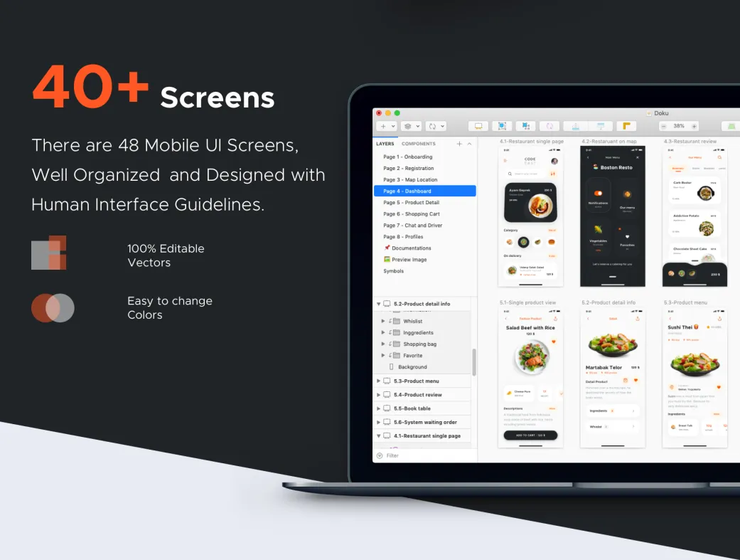 - بیش از ۴۰ صفحه: این کیت شامل بیش از ۴۰ صفحه طراحی شده با دقت (با ابعاد ۳۷۵x812px) است که نیازهای مختلف اپلیکیشنهای تحویل غذا را پوشش میدهد.