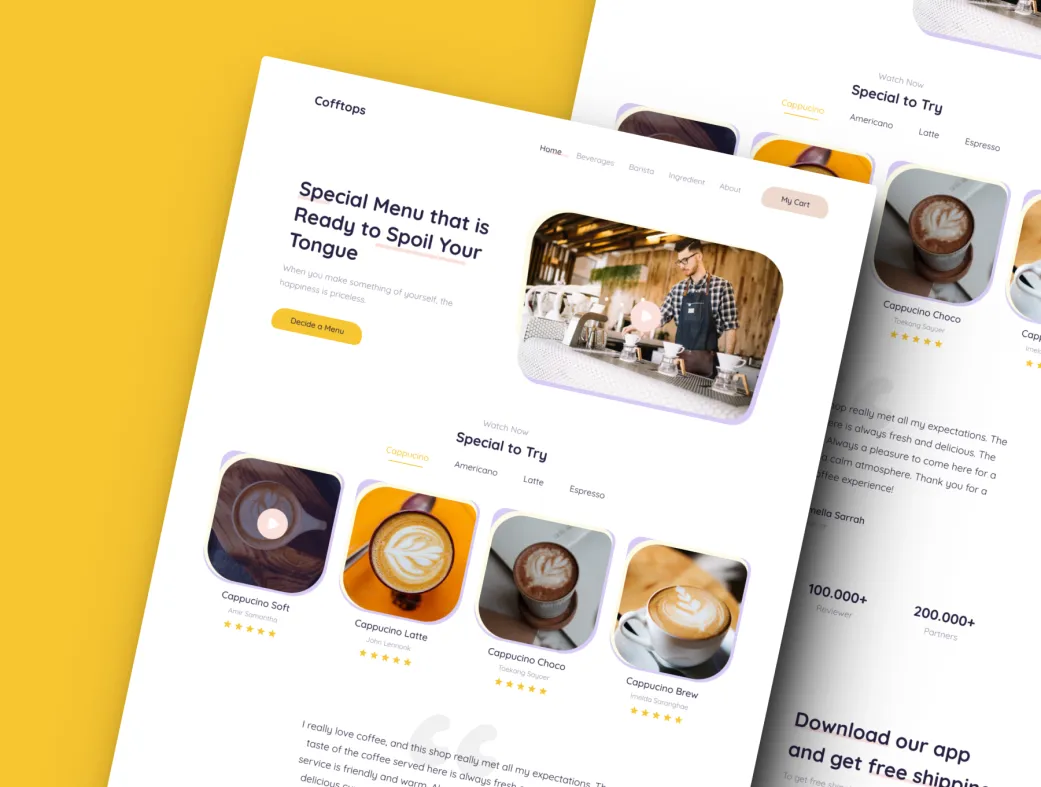 قالب وبسایت رایگان کافه با طراحی فیگما (Cofftops) یک الگوی زیبا و حرفهای برای وبسایتهای کافه و قهوهخانههاست که با استفاده از ابزار فیگما طراحی شده است. این قالب به شما این امکان را میدهد که به راحتی و با کمترین زمان ممکن، یک وبسایت جذاب و کاربرپسند برای کسبوکار خود ایجاد کنید.