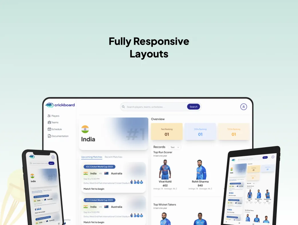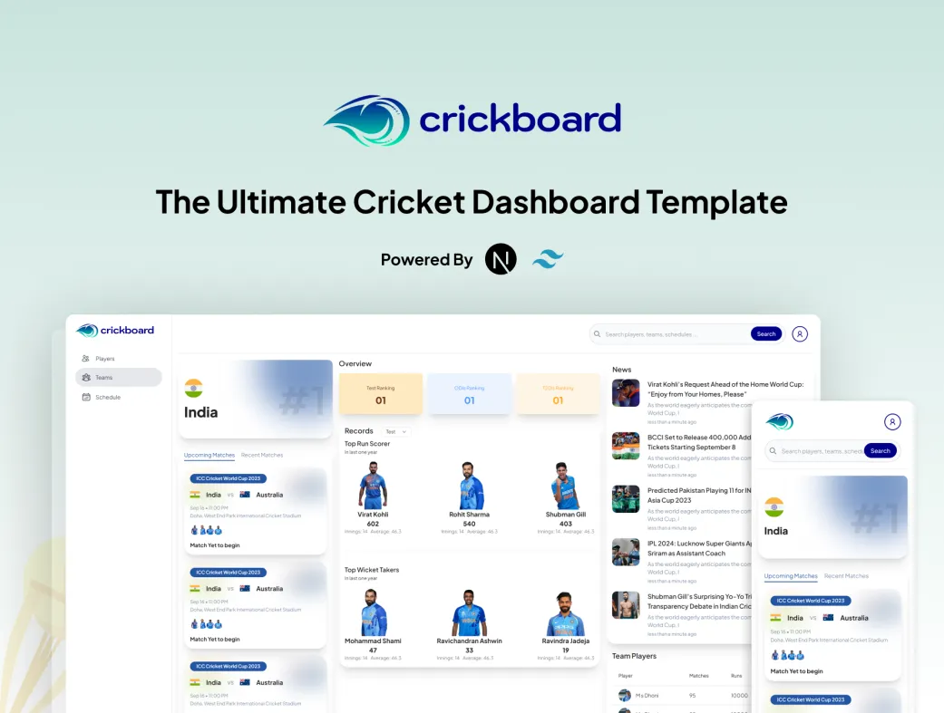 داشبورد کریکت نکسجیاس (Crickboard) یک الگوی جامع طراحی شده با NextJs و Tailwind CSS است که به طور خاص برای علاقهمندان به کریکت طراحی شده است. این الگو شامل صفحات متنوعی از جمله لیست بازیکنان، جزئیات بازیکنان، لیست تیمها و جزئیات تیمها است. چه در حال ساخت یک اپلیکیشن کریکت باشید و چه وبلاگ یا وبسایت مرتبط با ورزش، Crickboard تمام ابزارهایی که برای تجربهای جذاب و تعاملی نیاز دارید را در اختیار شما قرار میدهد.