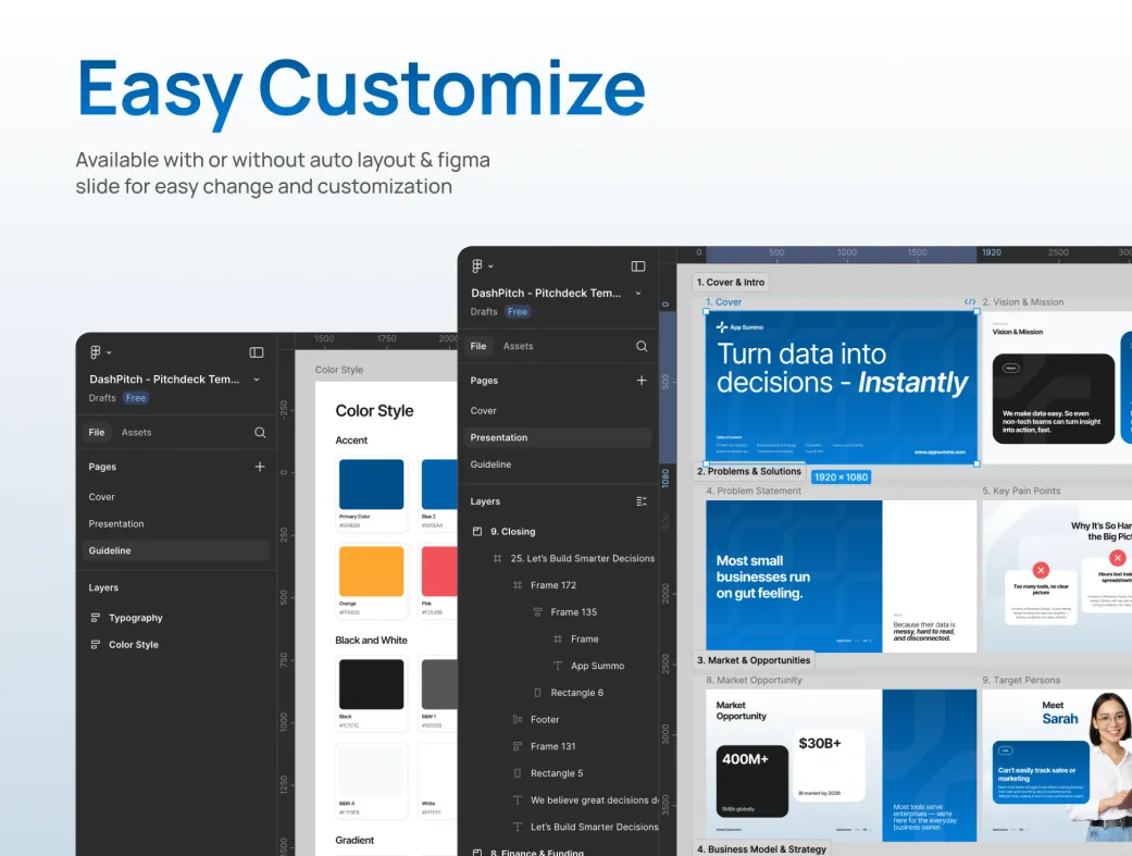 رنگها، فونتها و عناصر برندینگ را به راحتی تغییر دهید تا هویت منحصربهفرد برندتان را منعکس کند. این ویژگی داشپیچ را به گزینهای ایدهآل برای دانلود قالب پیتچ دک تبدیل کرده است.
