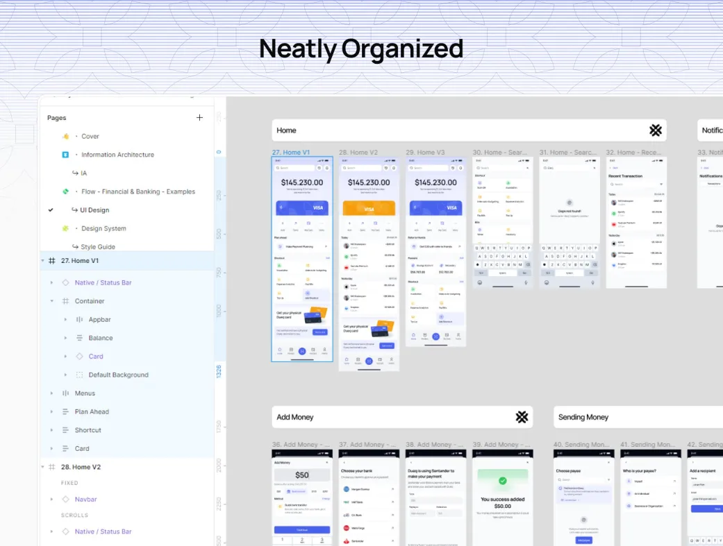 Dueq - کیت UI اپلیکیشن بانکداری موبایل یک مجموعه جامع از صفحات و کامپوننتهای قابل سفارشیسازی است که تجربهای seamless و کاربرپسند برای اپهای بانکی موبایل فراهم میکند. این کیت منحصراً برای Figma طراحی شده تا بهینهسازی آسان و بهروزرسانیهای سریع را تضمین کند. با بهرهگیری از معماری اطلاعاتی قوی، راهنماهای تایپوگرافی و رنگ، میتوانید پروتوتایپهای حرفهای بسازید و زمان طراحی را تا ۵۰٪ کاهش دهید.