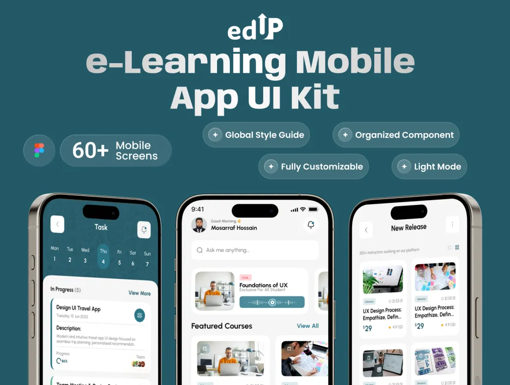 EduUP – Modern eLearning Mobile App UI Kit یک کیت حرفهای و کامل برای طراحی اپلیکیشنهای آموزشی موبایل است که مخصوص فیگما ساخته شده. اگر در حال ساخت اپلیکیشن آموزش آنلاین، پلتفرم یادگیری زبان انگلیسی، اپ مدیریت مدرسه، دورههای مجازی یا سرویس تدریس خصوصی هستید، این کیت تمام نیازهای شما را پوشش میدهد.