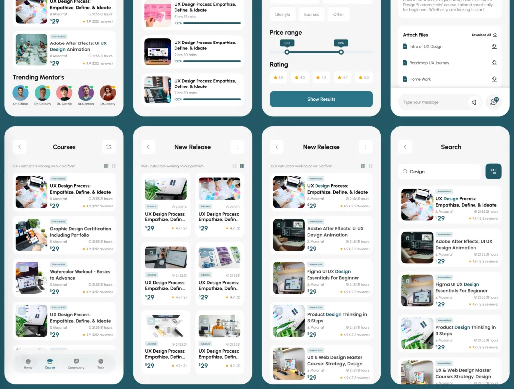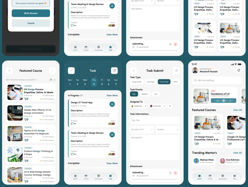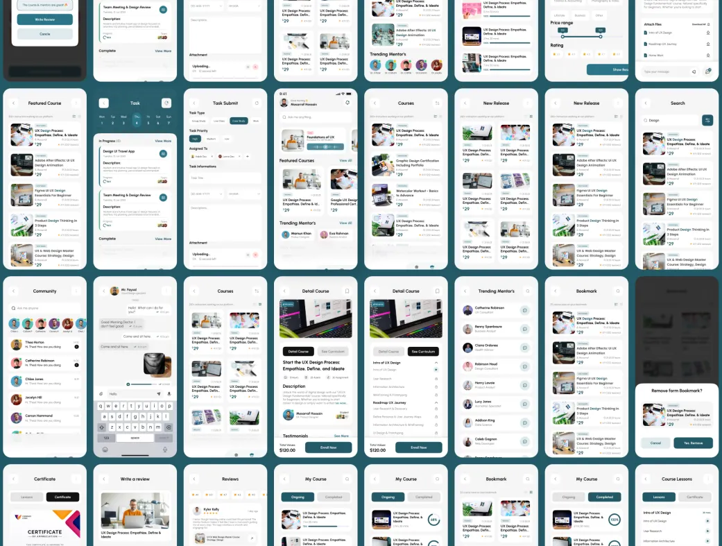 این UI Kit شامل مجموعه کاملی از صفحات ضروری اپلیکیشنهای eLearning است: