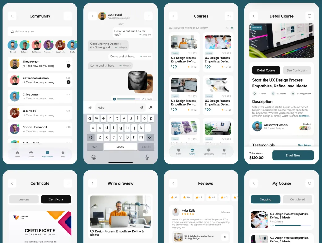 - شامل صفحات مهم: آنبوردینگ، لیست دورهها، درسها، پخش ویدیو، آزمون و کوئیز، پروفایل کاربر و بیشتر