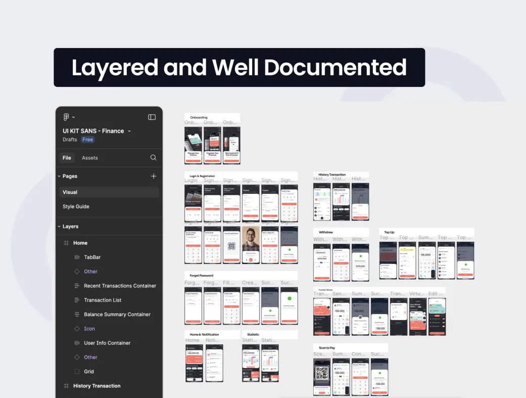 این کیت شامل بیش از ۴۰ صفحه آماده است، از داشبورد اصلی تا صفحات تراکنش و تنظیمات. فایلهای فیگما لایهبندی شده و سازمانیافته برای ویرایش آسان ارائه میشوند.