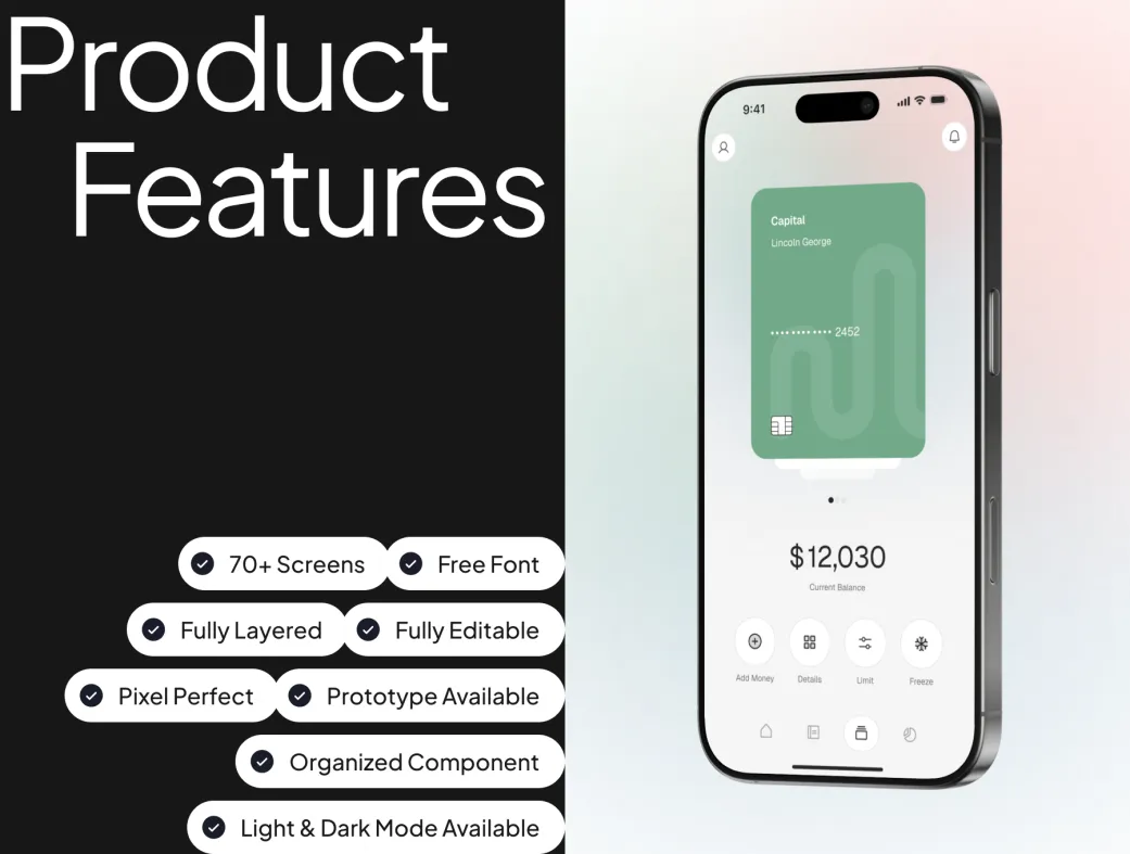 کیت UI اپلیکیشن مدیریت مالی موبایل در حالتهای روشن و تاریک ساخته شده و بدون نیاز به تنظیم اضافی، به ترجیحات بصری مختلف سازگار میشود. علاوه بر این، شامل فونتهای رایگان و سازگاری ۱۰۰% با فیگما است تا بدون مانع مستقیماً به طراحی بپردازید.