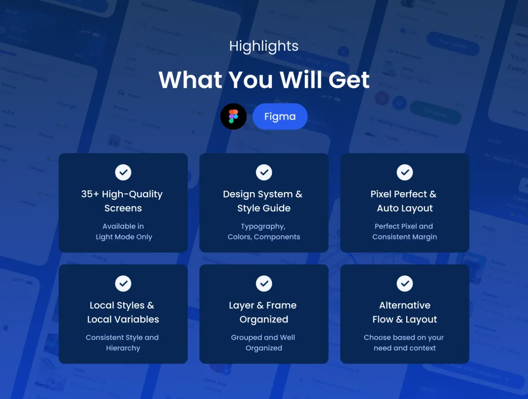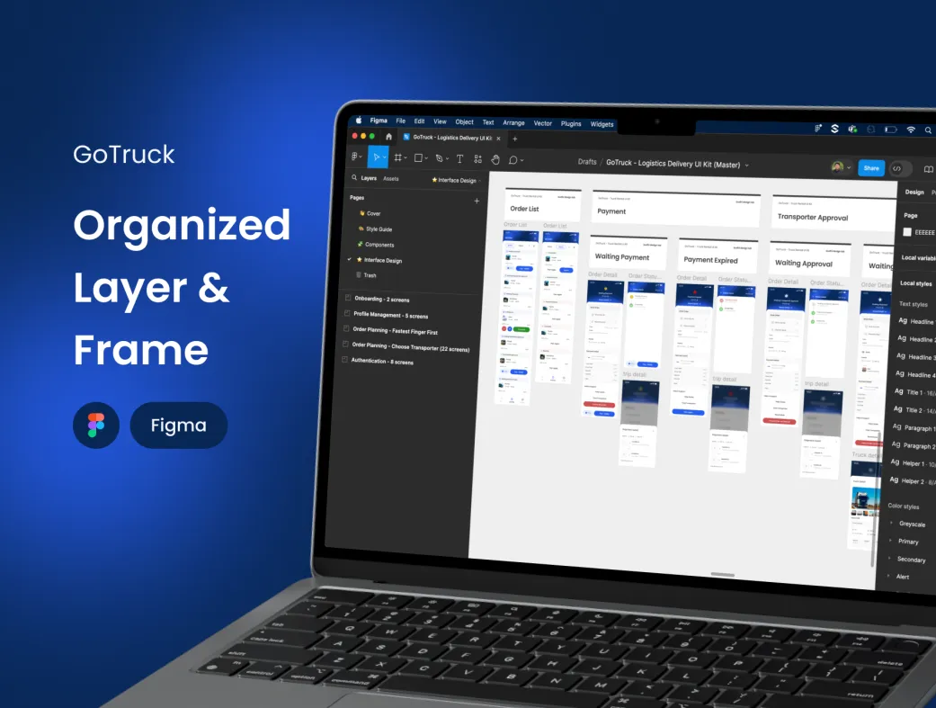 GoTruck با استفاده حداکثری از ویژگیهای پیشرفته فیگما، به شما امکان میدهد محصول نهایی را سریعتر و حرفهایتر به مشتریان تحویل دهید. اگر بهدنبال قالب فیگما اپلیکیشن پیک یا کیت UI ارسال کالا با کیفیت بالا هستید، این محصول انتخاب عالی برای شروع پروژه شماست.
