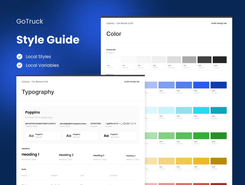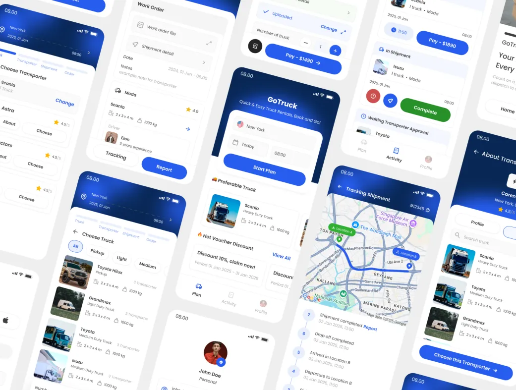 GoTruck | Bud Design Lab یک کیت رابط کاربری حرفهای و جامع برای اپلیکیشن حمل بار، پیک موتوری و لجستیک تحویل کالا است. این قالب فیگما با بیش از ۳۵ اسکرین باکیفیت در تم روشن طراحی شده و بهراحتی قابل شخصیسازی برای پروژههای مختلف ارسال کالا و سفارش آنلاین است.