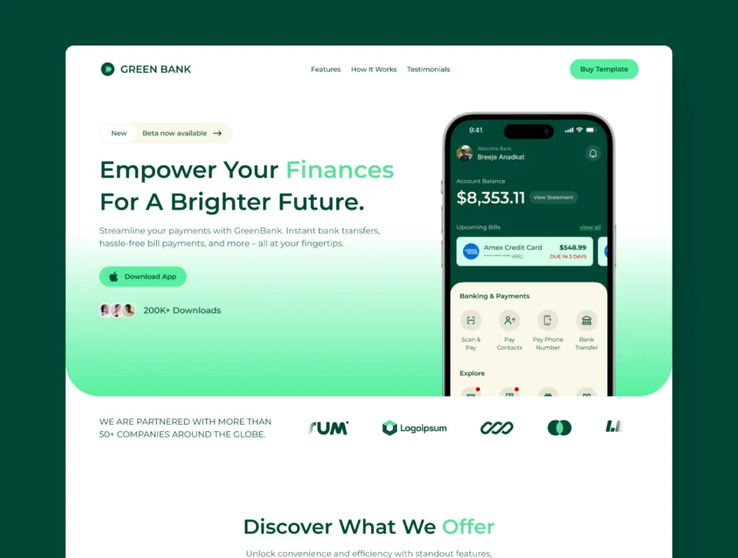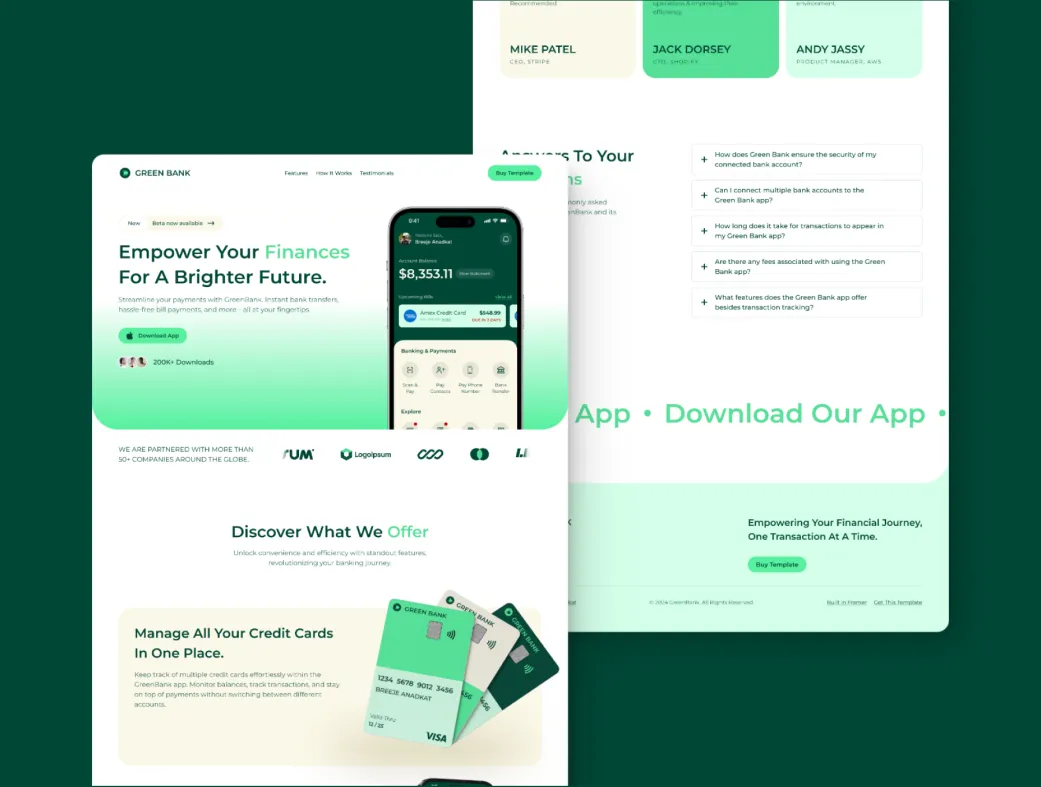 قالب Green Bank فریمِر یک تمپلیت حرفهای و آماده برای ساخت لندینگ پیج اپلیکیشن موبایل است که مخصوص معرفی اپهای بانکی، فینتک و مدیریت مالی طراحی شده. این قالب با تمرکز بر تجربه کاربری جذاب، به شما کمک میکند تا در کمترین زمان یک صفحه فرود زیبا و متقاعدکننده بسازید و نرخ تبدیل بازدیدکننده به دانلود اپ را افزایش دهید.