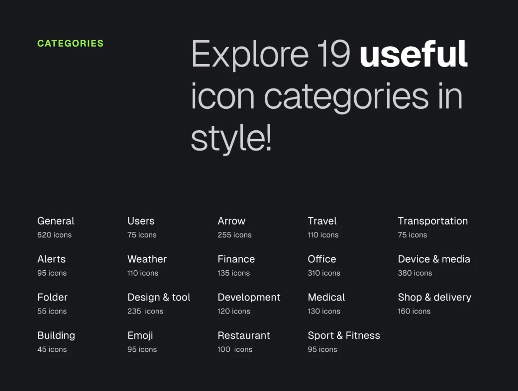 این مجموعه شامل ۱۹ دستهبندی محبوب است که شامل انواع مختلفی از آیکونها میشود. -