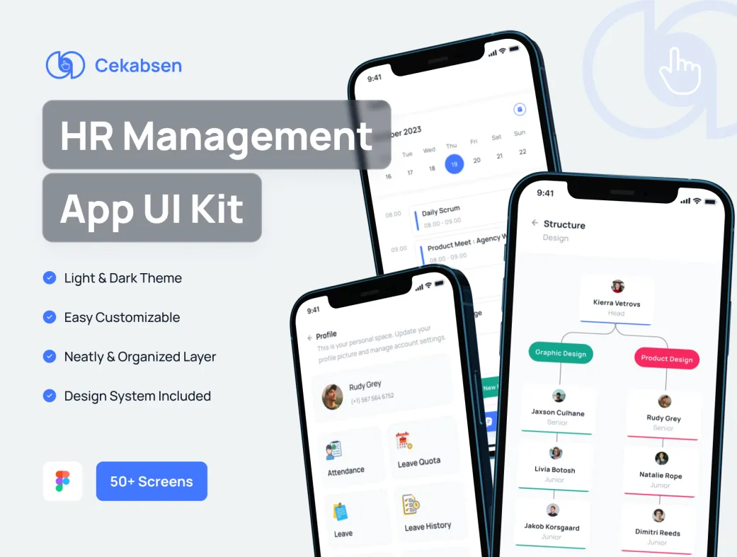 کیت UI اپ مدیریت منابع انسانی موبایل | Cekabsen برای اپهای iOS و موبایلهای عمومی مناسب است و شامل تمام ویژگیهای فیگما مانند راهنمای سبک جهانی، کامپوننتهای پویا،خودکار و واریانتها میشود. طراحان میتوانند از آن برای ایجاد رابط کاربریهای سریع و جذاب استفاده کنند، که نرخ تبدیل کاربران را افزایش میدهد.