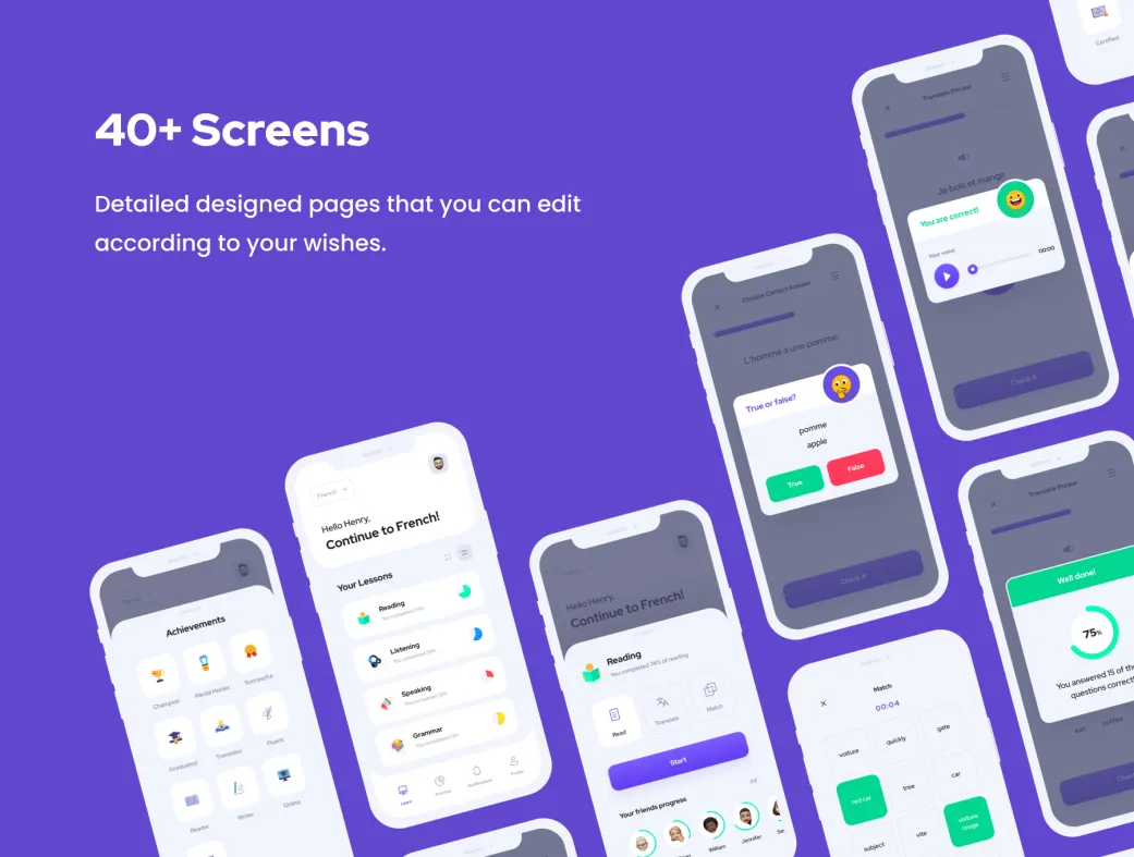با استفاده از کیت UI فیگما اپلیکیشن یادگیری زبان iOS، پروژههایتان را با کیفیت بالا و سرعت پیش ببرید و کاربران را با رابط کاربری جذاب مجذوب کنید.