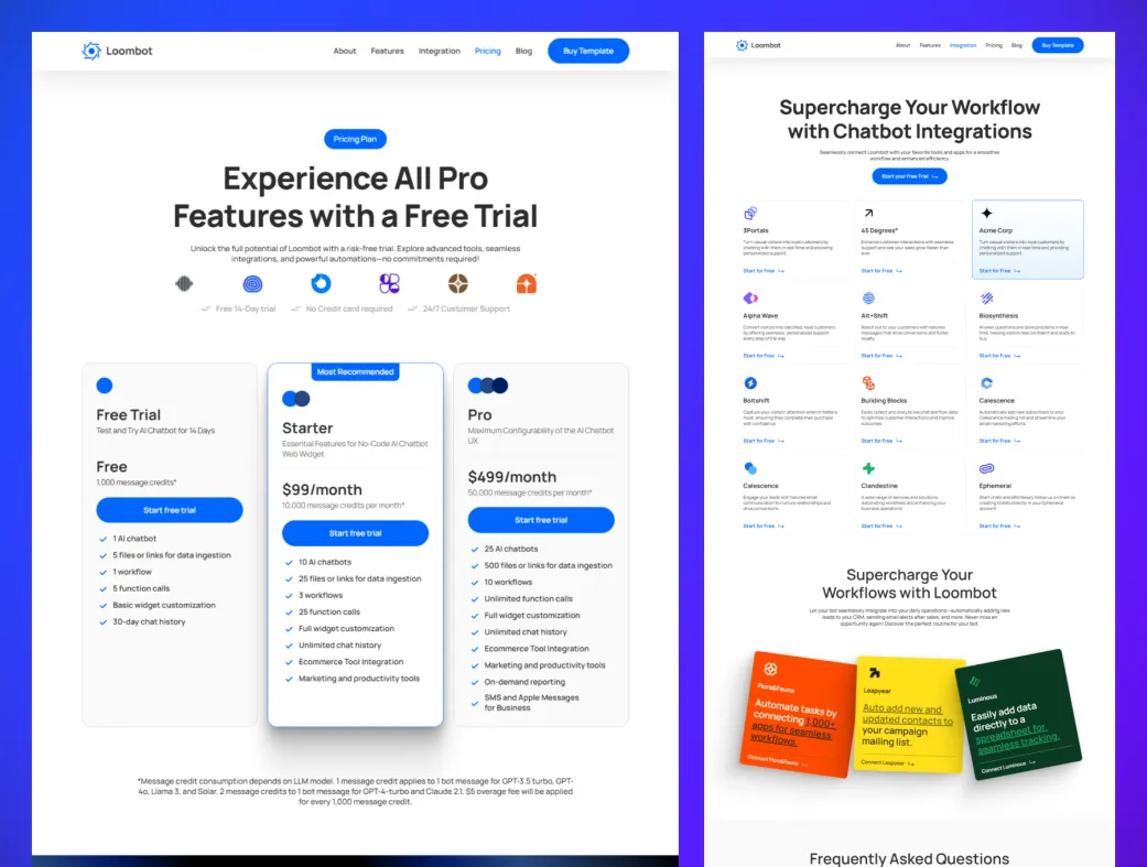 این قالب به شما کمک میکند تا بدون زحمت اعتماد مشتریان خود را جلب کنید. با برجسته کردن موارد استفاده، نظرات مشتریان و داستانهای موفقیت، شما میتوانید به راحتی از مزایای محصولات خود بهره ببرید. علاوه بر این، LoomBot به طور کامل پاسخگو است و در تمامی دستگاهها به خوبی نمایش داده میشود.