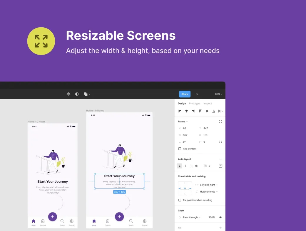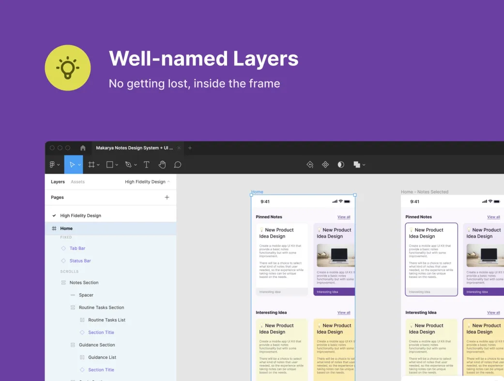 کیت Makarya Notes به شما این امکان را میدهد که با استفاده از صفحات قابل تغییر اندازه، طراحیهای خود را برای انواع مختلف صفحهنمایشها به راحتی انجام دهید. لایههای مشخص و با نامگذاری دقیق در هر فریم صفحه، به شما کمک میکند تا به راحتی به اجزای مختلف دسترسی پیدا کنید و با سرعت بیشتری پروژۀ خود را پیش ببرید. علاوه بر این، وجود یک پروتوتایپ تعاملی به شما این امکان را میدهد که پیشنمایش دقیقی از عملکرد اپلیکیشن خود داشته باشید و تجربه کاربری بهتری را برای کاربران نهایی خود فراهم کنید.