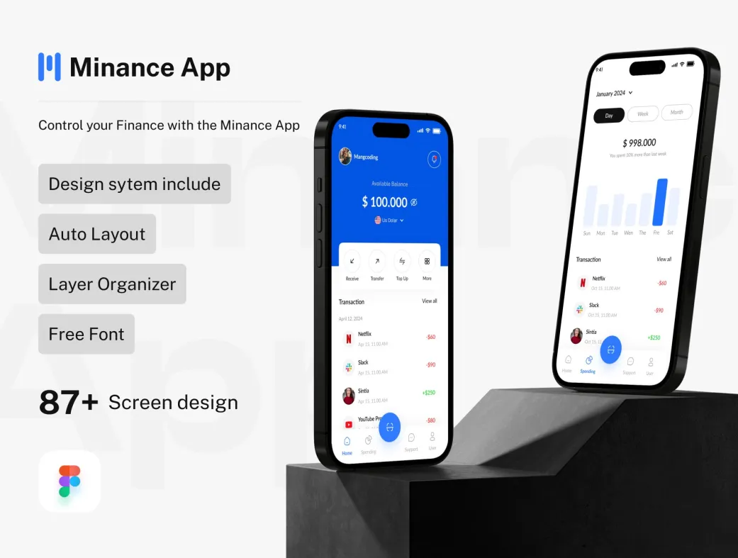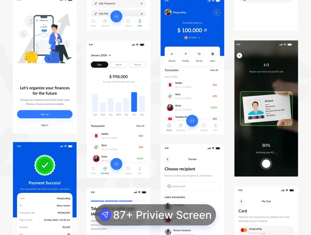 کیت رابط کاربری اپلیکیشن مالی و بانکداری Minance یک مجموعه کامل از طراحیهای مدرن و جذاب برای مدیریت مالی است. این کیت شامل بیش از 87 صفحه با کیفیت بالا و 1000+ عنصر کاربر پسند میباشد که به شما این امکان را میدهد تا به سادگی و سرعت پروژههای مالی خود را طراحی و اجرا کنید. فایلهای این کیت در نرمافزار فیگما قابل استفاده است و به طور کامل با نیازهای شما سازگار میشود.