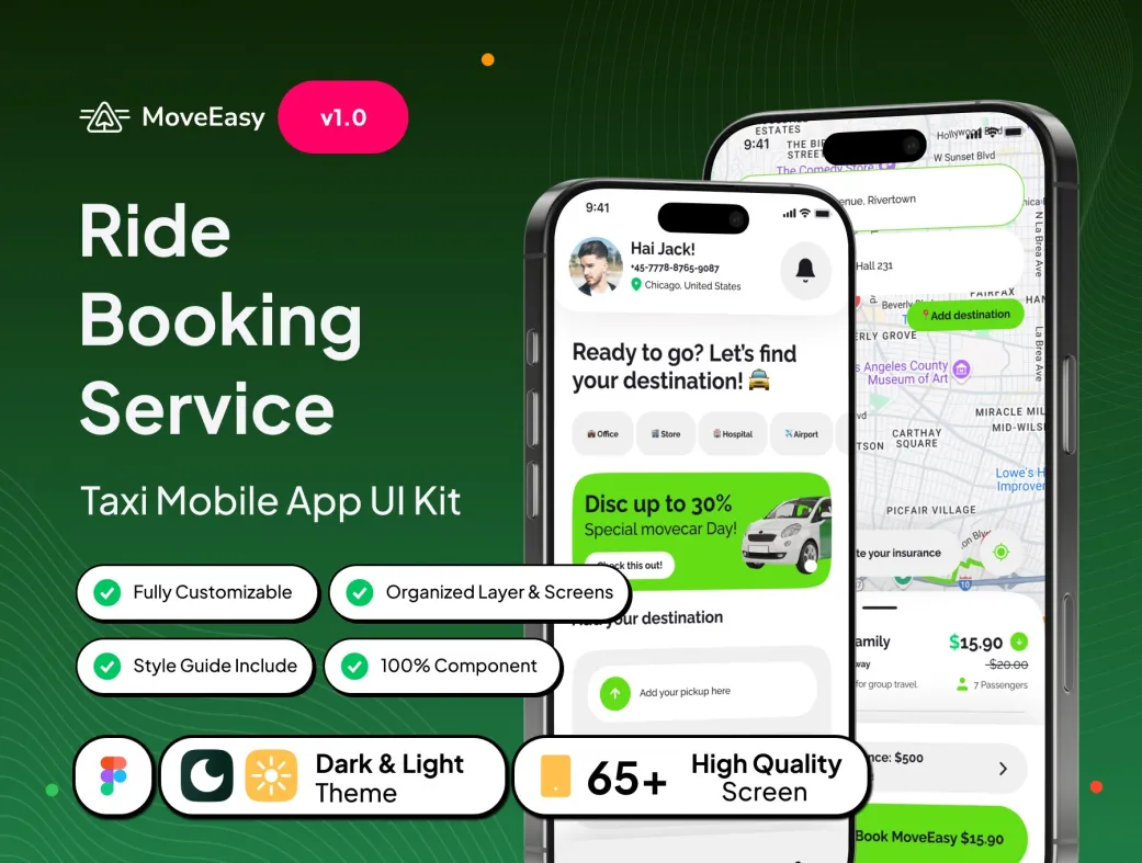 کیت MoveEasy با بیش از ۶۵ صفحه و ۴۸۰ کامپوننت، آماده پروتوتایپ و کاملاً قابل ویرایش است و با حالتهای روشن و تاریک سازگار میشود. این کیت برای طراحان و توسعهدهندگان ایدهآل است و فرآیند طراحی اپلیکیشن تاکسی را سریعتر میکند.