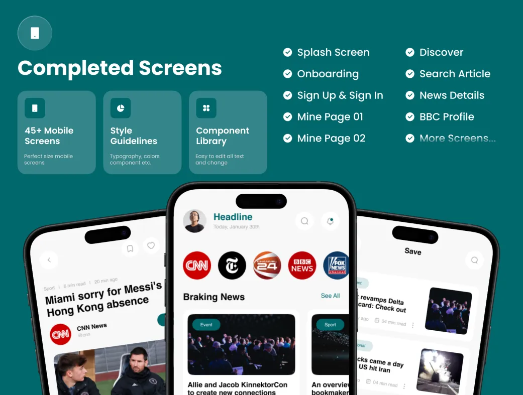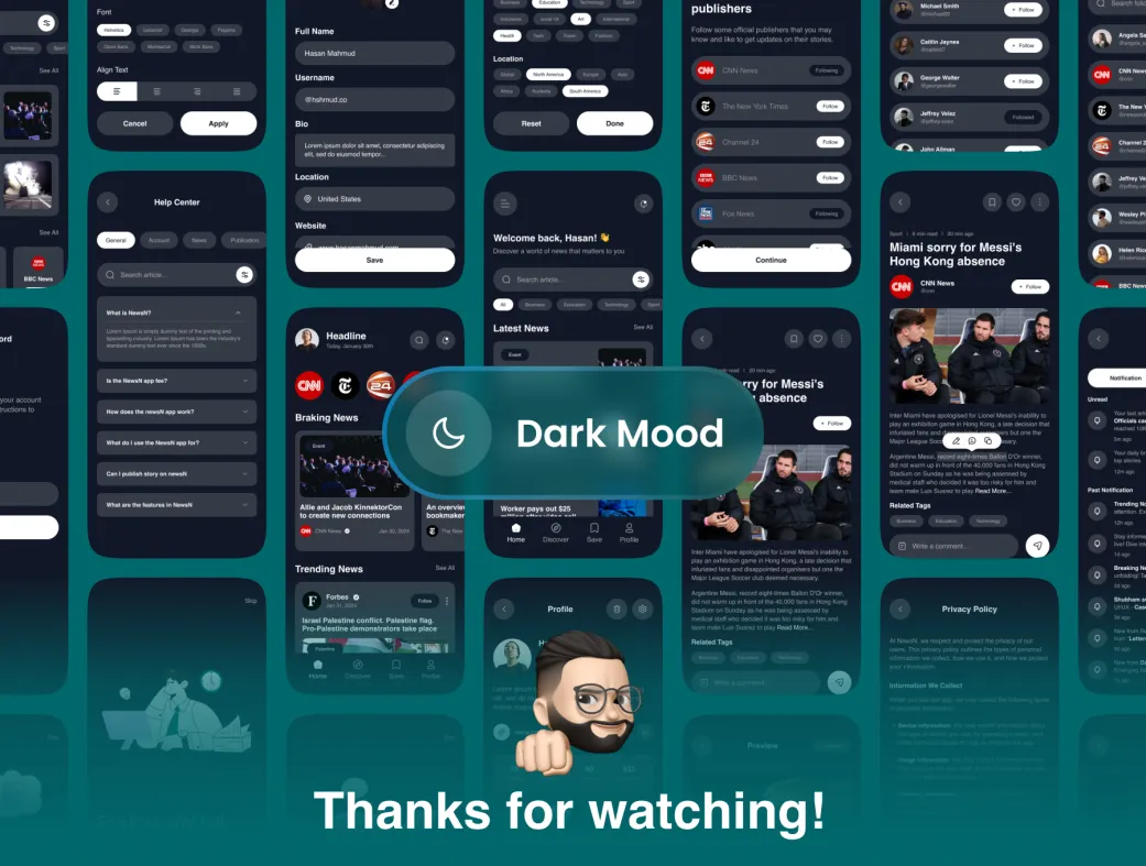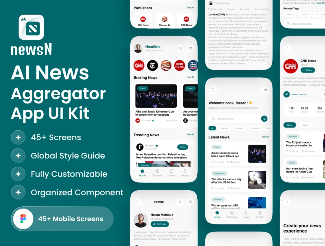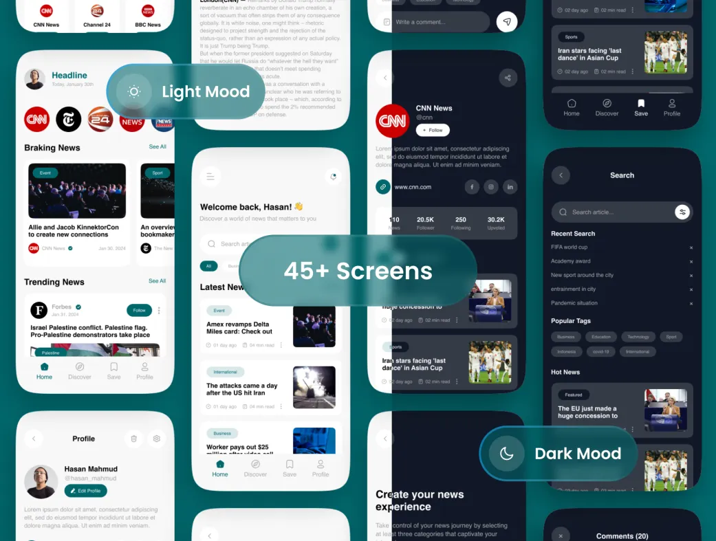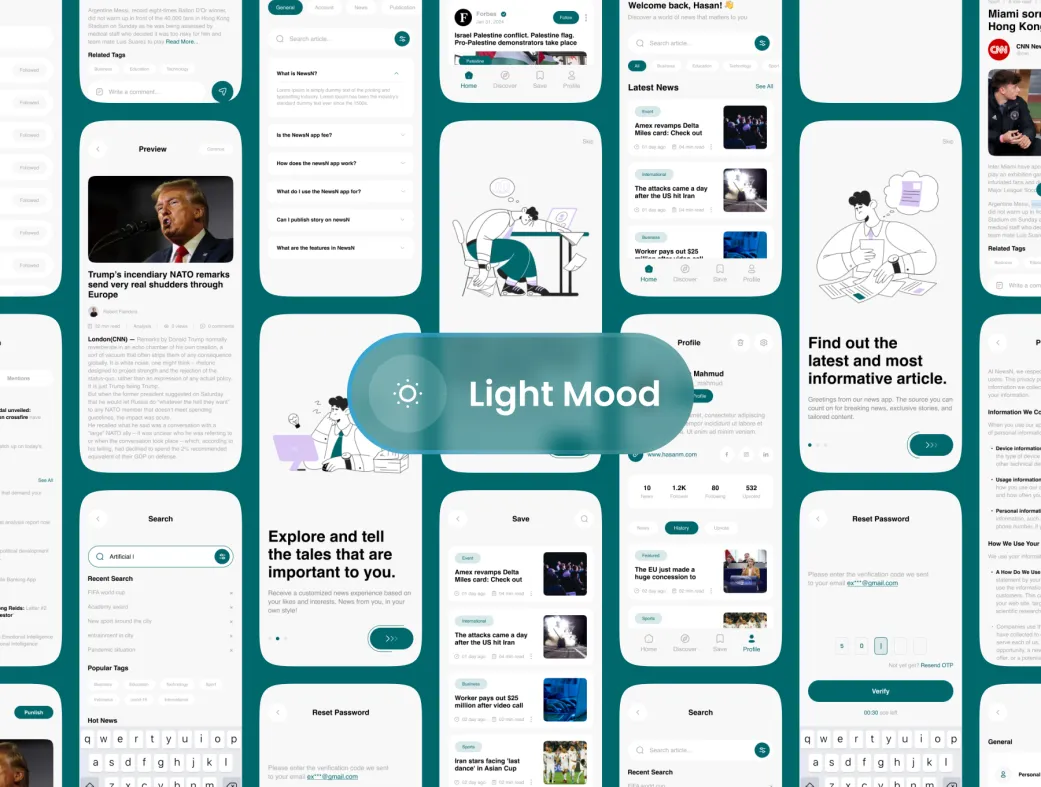 کیت UI اپلیکیشن جمعآوری اخبار هوش مصنوعی نیوزان (NewsN) یک بسته با کیفیت بالا است که برای سیستمهای عامل iOS و Android طراحی شده است. این الگو شامل بیش از ۴۵ صفحه نمایش موبایل با نسخههای روشن و تاریک میباشد و به شما این امکان را میدهد تا یک اپلیکیشن خبری حرفهای با قابلیتهای هوش مصنوعی را ایجاد کنید.