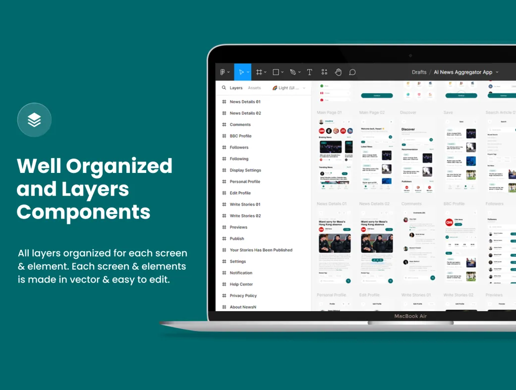 کیت UI نیوزان ۱۰۰% وکتور و قابل سفارشیسازی است، به این معنی که میتوانید بهراحتی طرحها را تغییر دهید و مطابق با نیاز خود شخصیسازی کنید. فایلهای Fig آن بهراحتی قابل تنظیم هستند و طراحی پیکسلکامل آن تضمین میکند که خروجی نهایی شما کاملاً حرفهای و جذاب خواهد بود.