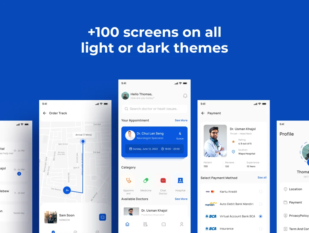این کیت شامل ۱۰ صفحه اصلی از جمله صفحهٔ شروع، ورود به سیستم، ثبتنام، صفحهٔ اصلی، ایجاد نوبت و مشاوره، خرید دارو، و جستجوی بیمارستان است.آیا میتوانم این کیت را در پروژههای تجاری استفاده کنم؟