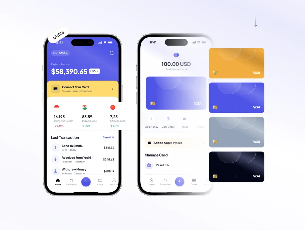 طراحی مینیمال کیت UI اپلیکیشن موبایل انتقال پول Paytods با روندهای فینتک امروز همخوانی دارد. شفافیت بالا و ناوبری آسان، کاربران را به استفاده مداوم تشویق میکند و نرخ تبدیل اپ را افزایش میدهد.