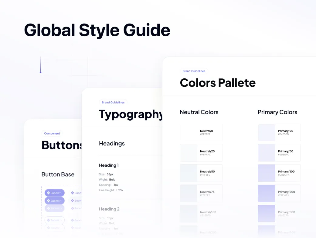 راهنمای سبک دقیق شامل تایپوگرافی، پالت رنگی، استایل دکمهها و آیکونوگرافی است. این ابزار consistency پروژه را حفظ میکند و فرآیند طراحی را تسریع میبخشد.