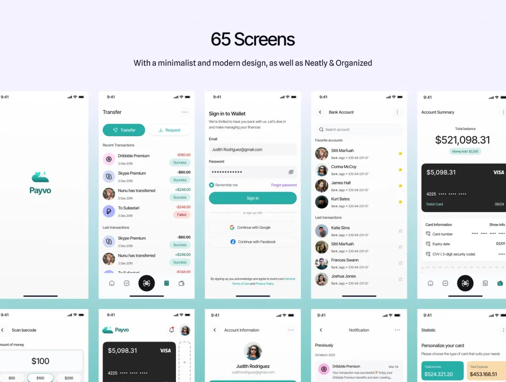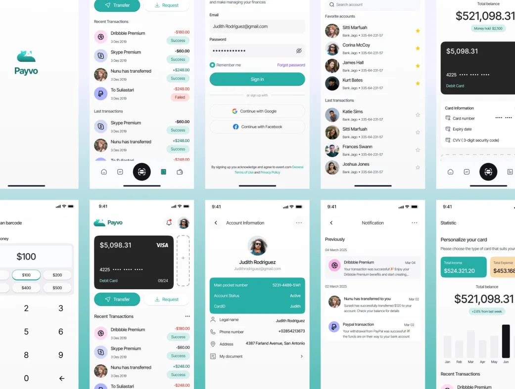 با Payvo، امور مالی کاربرتان را به سطح بعدی ببرید؛ این طرح UI اپلیکیشن بانکداری موبایل مدرن و حرفهای، مدیریت پول را بدون دردسر ممکن میکند. چه در حال پیگیری هزینههای شخصی، مدیریت حسابهای تجاری یا برنامهریزی آینده مالی باشید، Payvo همه ابزارهای لازم برای تجربه بانکی سریع و هوشمند را ارائه میدهد. با بیش از ۶۵ صفحه پیکسل-پرفکت، سیستم طراحی جامع و autolayout فیگما، امنیت، انعطافپذیری و تجربه کاربری عالی تضمین شده است.