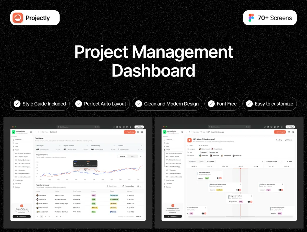 کیت Projectly برای طراحی داشبوردهای مدیریت پروژه، راهاندازی وبسایتهای مدیریتی و ارائه بصری اطلاعات در جلسات بسیار مناسب است. کاربران حرفهای میتوانند با استفاده از ویرایشگر فیگما، این کیت را به دلخواه خود سفارشیسازی کنند و کاربران مبتدی نیز میتوانند به سادگی از صفحات آماده و راهنمای استایل برای ایجاد پروژههای خود استفاده کنند.