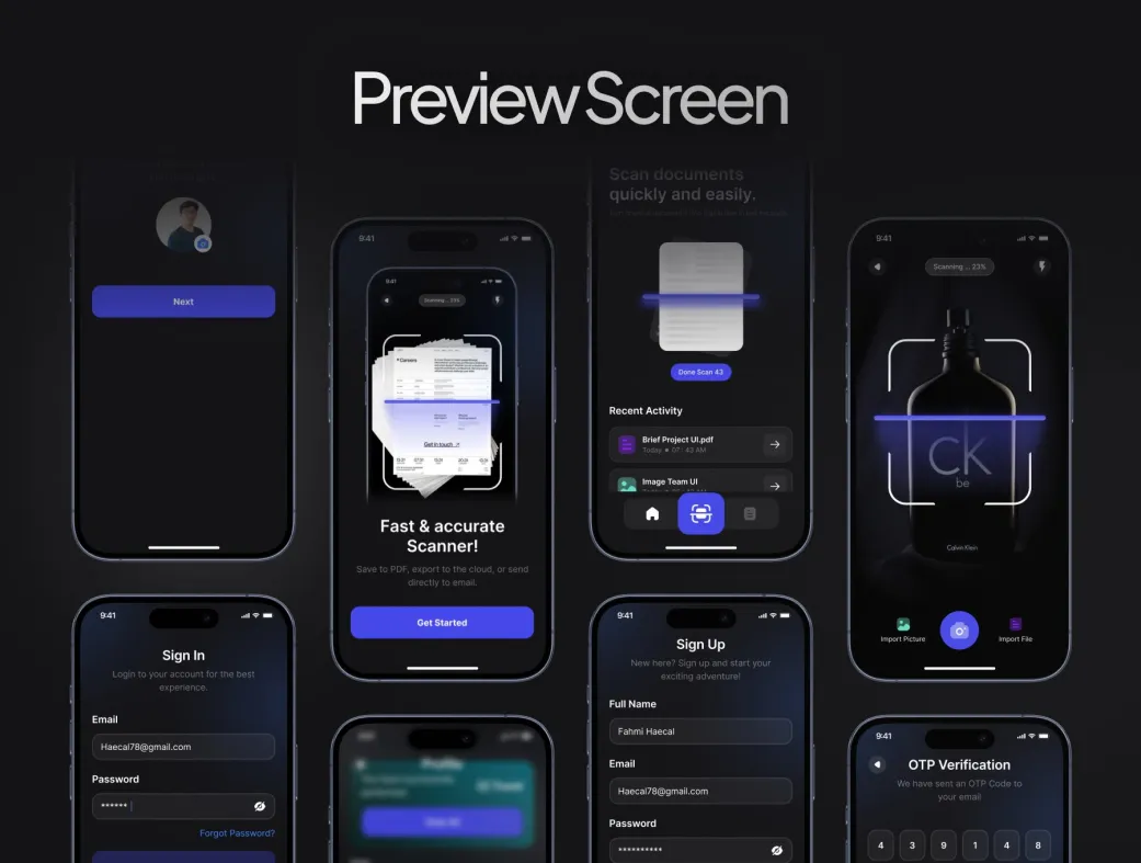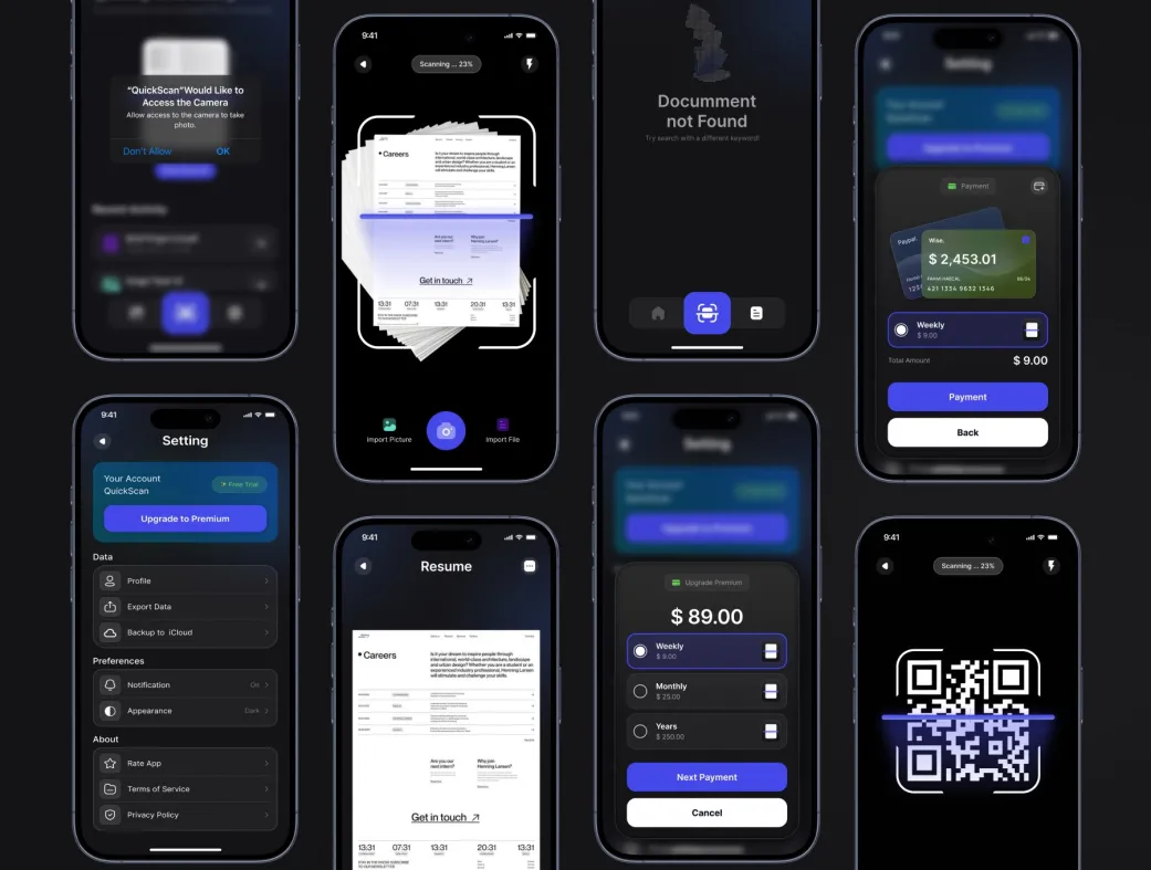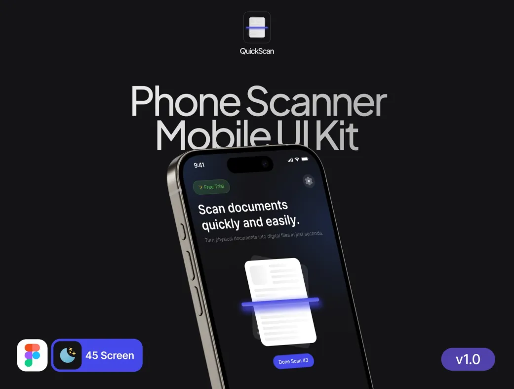کیت UI اسکنر گوشی کوییکاسکن (QuickScan) یک بسته رابط کاربری مدرن و مینیمالیستی برای برنامههای اسکنر اسناد است که بهطور خاص برای ارائه تجربه کاربری سریع، شهودی و کارآمد طراحی شده است. این کیت شامل ویژگیهایی مانند اسکن خودکار، مدیریت فایل، صادرات PDF و ذخیرهسازی ابری است که آن را برای برنامههای بهرهوری، دفتر دیجیتال یا راهحلهای اسناد موبایل مناسب میسازد.