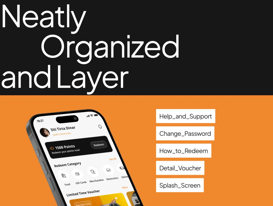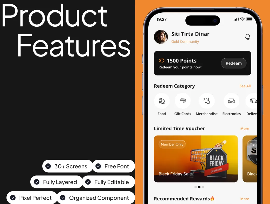 این مجموعه شامل اسکرینهای کلیدی مانند صفحه اصلی، پروفایل کاربر، لیست جوایز قابل دریافت، صفحه redeem امتیاز، تاریخچه امتیازها، جزئیات هر جایزه، مدیریت آیتمها و بسیاری صفحات کاربردی دیگر است. تمام عناصر بهصورت کامپوننتهای reusable طراحی شدهاند تا سرعت طراحی شما را چندین برابر کنند.