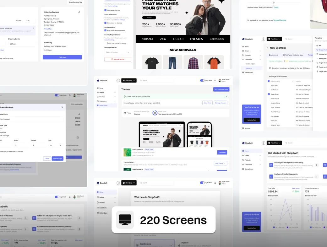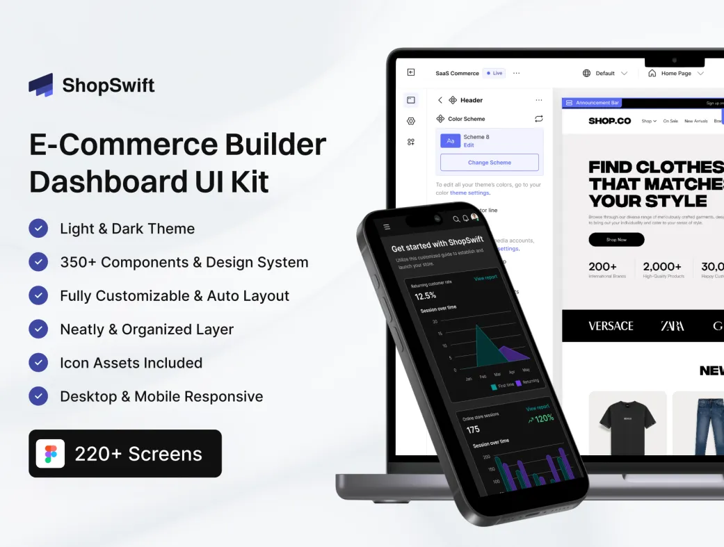 کیت رابط کاربری داشبورد سازنده تجارت الکترونیک ShopSwift، یک مجموعه طراحی با کیفیت بالا و با جزئیات دقیق است که به راحتی در نرمافزار فیگما قابل استفاده میباشد. این کیت شامل ۲۲۰ صفحه طراحی واکنشگرا با تمهای روشن و تاریک است که میتواند به شما در ساخت انواع پروژههای تجارت الکترونیک کمک کند.