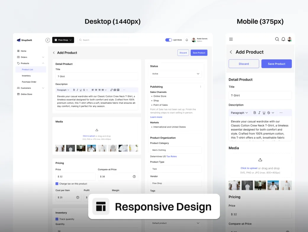کیت ShopSwift شامل طراحیهای مختلف برای داشبورد، صفحات خرید و مدیریت مشتریان است که به شما در ساخت یک تجربه کاربری کامل کمک میکند.
