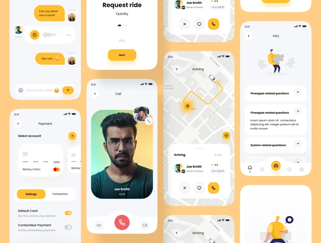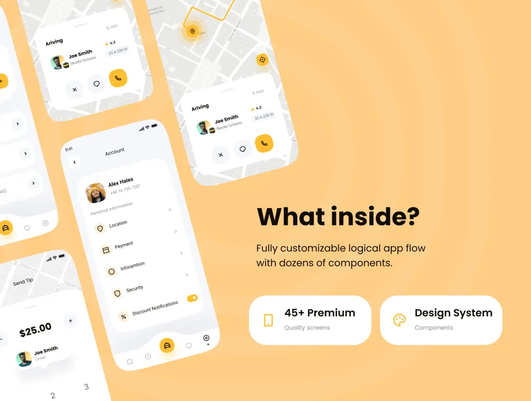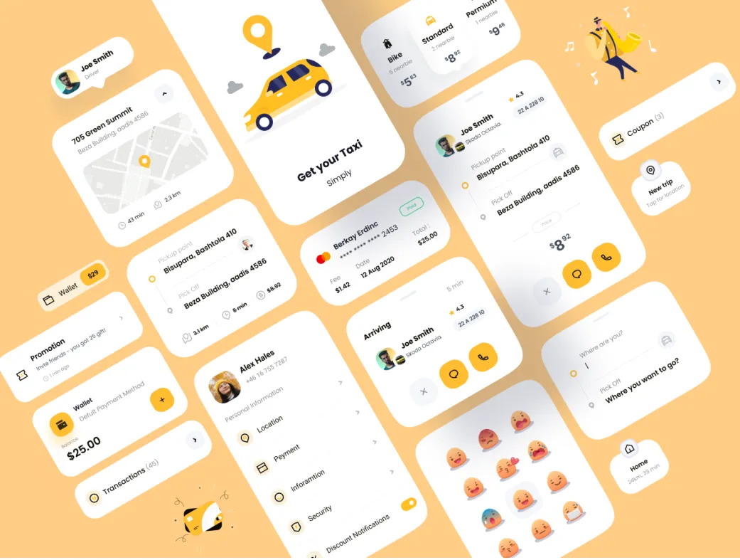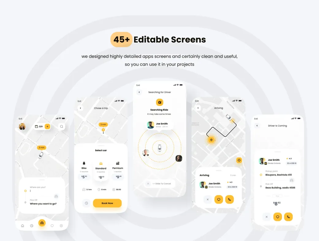 این کیت بیش از ۴۵ اسکرین باکیفیت بالا دارد که همه جنبههای یک اپلیکیشن تاکسی هوشمند را پوشش میدهد. طراحی ساده، تمیز و شیک آن با ترندهای روز UI/UX هماهنگ است و به شما امکان میدهد پروژهتان را سریعتر به مرحله اجرا برسانید.