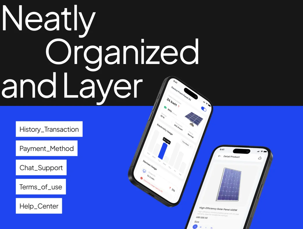 کیت UI اپلیکیشن پنل خورشیدی با تمرکز بر وضوح، تمیزی و دسترسی آسان ساخته شده. ناوبری هوشمند، اعلانهای کاربردی و عناصر تعاملی، تجربهای جذاب و کارآمد ایجاد میکنند. پالت رنگی متعادل و تایپوگرافی مدرن، ظاهر بصری را تقویت کرده و همه جزئیات برای بهترین عملکرد بهینهسازی شدهاند.