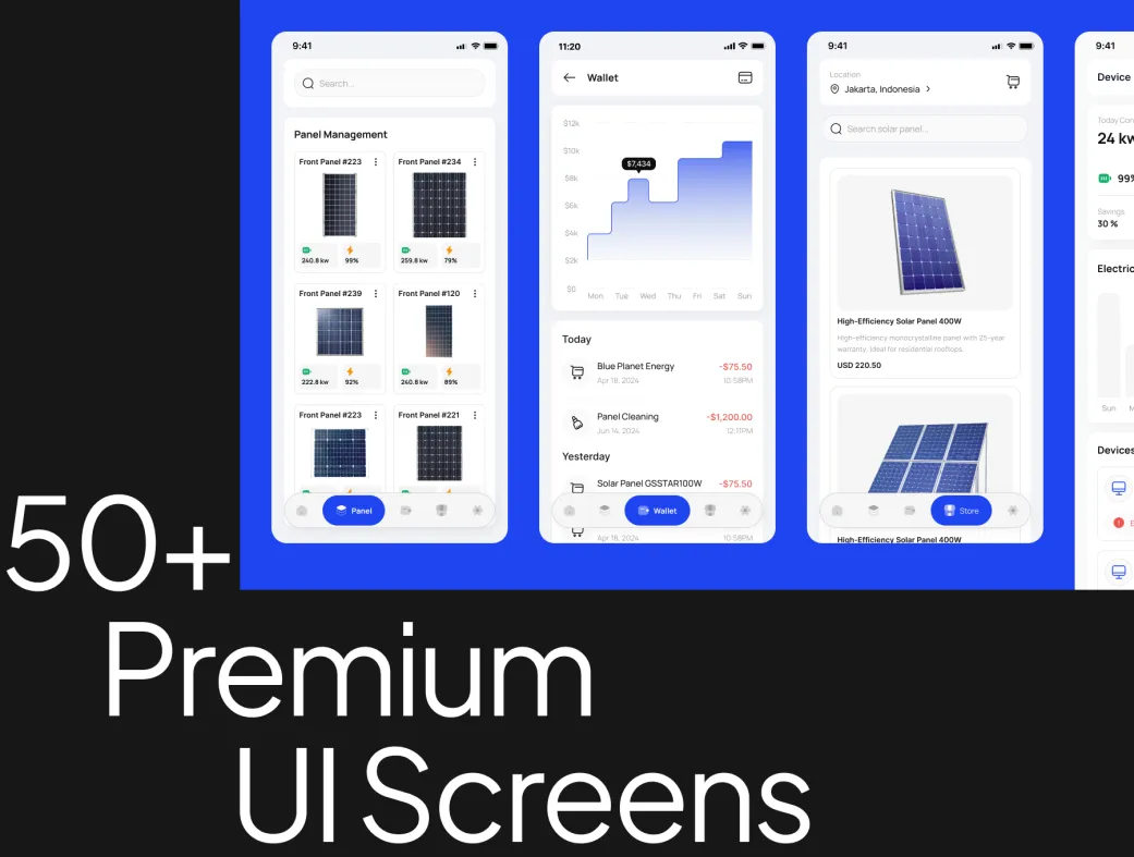 با کیت UI اپلیکیشن پنل خورشیدی به راحتی اپلیکیشن انرژی پاک خود را بسازید و کاربران را به سمت زندگی پایدار هدایت کنید. 🌞