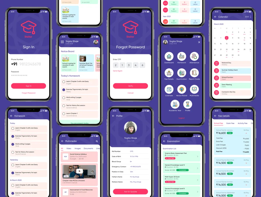 کیت UI اپلیکیشن مدرسه استلار - پنل دانشآموز یکی از بخشهای کلیدی سیستم جامع مدیریت مدرسه است که تجربه کاربری عالی برای دانشآموزان فراهم میکند. این کیت بخشی از مجموعه اپلیکیشنهای موبایل برای مدیر، معلم، دانشآموز، امور مالی و رانندگان اتوبوس است و با تمرکز بر ماژول دانشجویی طراحی شده تا نیازهای روزمره دانشآموزان را به بهترین شکل پوشش دهد.