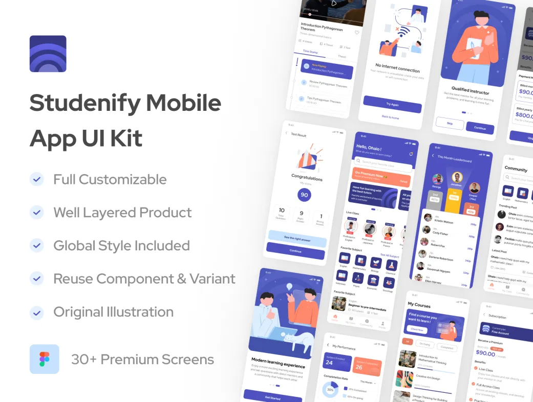 کیت UI اپلیکیشن موبایل آموزش آنلاین | Studenify یک پکیج پرمیوم و باکیفیت است که در نرمافزار فیگما طراحی شده و شامل ۳۴ صفحه کاملاً قابل سفارشیسازی میشود. این کیت با استفاده از Auto Layout، انعطافپذیری بالایی برای اضافه یا حذف عناصر ارائه میدهد و برای توسعهدهندگان و طراحان UI/UX ایدهآل است.