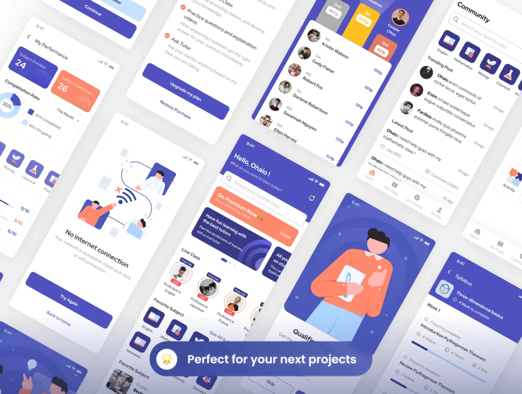 از وایرفریم اولیه تا پروتوتایپ نهایی، این کیت برای اپهای آنلاین کورس، پلتفرمهای یادگیری و ابزارهای آموزشی موبایل کاربرد دارد. با کیت UI اپلیکیشن موبایل آموزش آنلاین | Studenify، طراحی واکنشگرا و تمیز را تجربه کنید و پروژههایتان را به سطح حرفهای برسانید.