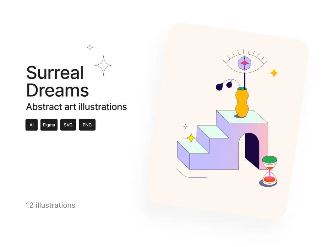 ست ایلاستریشن رویاهای سوررئال میتواند مفاهیمی مانند مراحل خواب، مدیتیشن، mindfulness، درمان holistic و حالات خلقی را به زیبایی بازنمایی کند. این ایلاستریشنها با سبک انتزاعی، به طراحان کمک میکنند تا ایدههای پیچیده را ساده و جذاب بیان کنند، که در جستجوهای پرطرفدار مانند "ایلاستریشن رویا" یا "طراحی انتزاعی" رتبه بالایی کسب میکند.