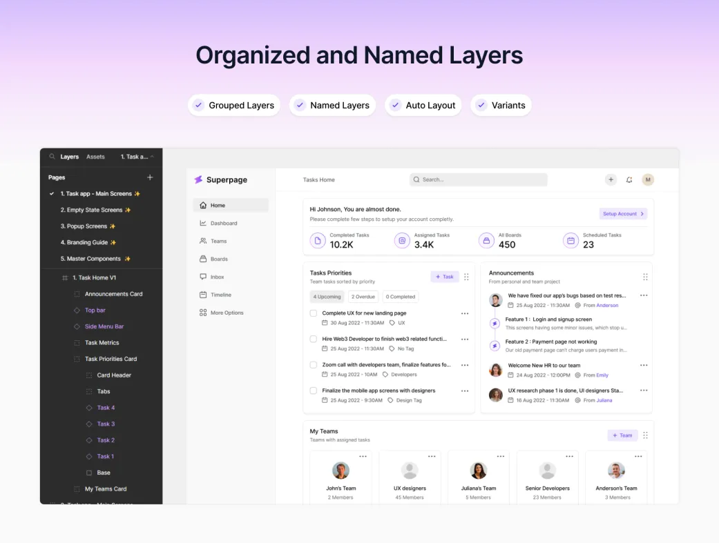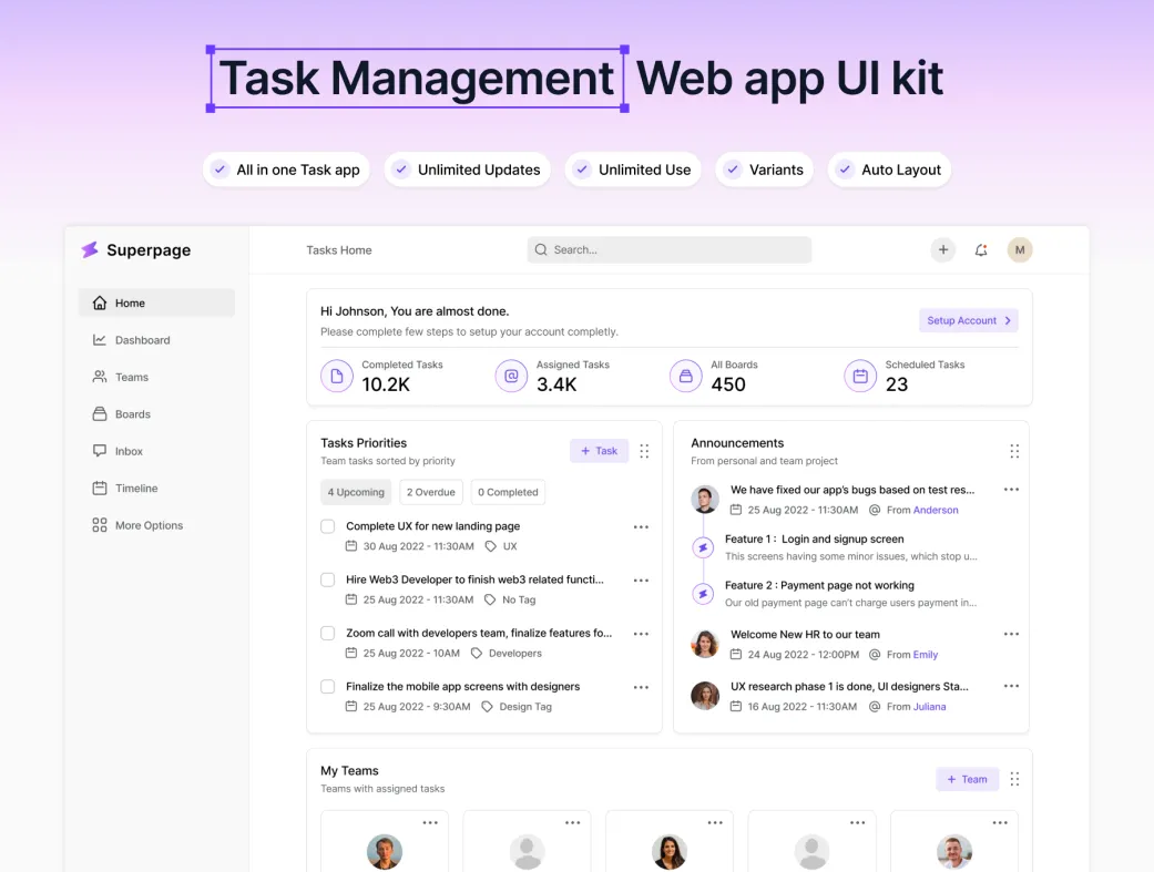 کیت UI اپ مدیریت وظایف و پروژه یک مجموعه کامل و مدرن از المانهای رابط کاربری است که برای طراحان وب و دسکتاپ طراحی شده. این کیت با تمرکز بر اپهای SaaS، به شما کمک میکند تا پروژههای خود را بدون اتلاف زمان راهاندازی کنید. ما قبل از طراحی، اپهای مدیریت وظایف محبوب را تحلیل کردیم تا مطمئن شویم این ابزار دقیقاً نیازهای واقعی کاربران را برآورده میکند. اگر به دنبال قالب UI فیگما برای اپهای بهرهوری هستید، این کیت ایدهآل شماست.