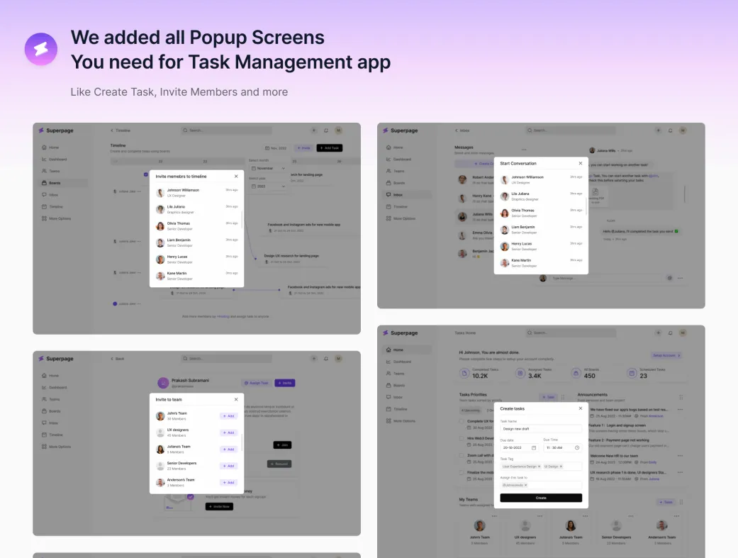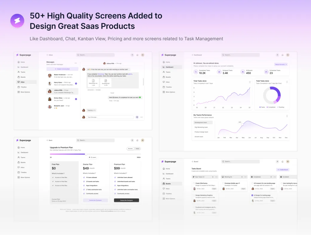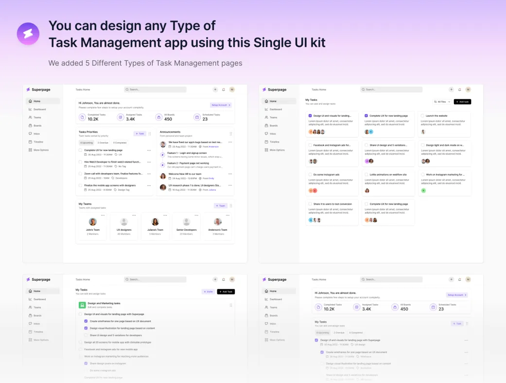این کیت برای توسعه اپهای وب و دسکتاپ مدیریت پروژه ایدهآل است، از داشبوردهای اصلی تا صفحات جزئیات وظایف. طراحان میتوانند آن را برای اپهای تیمی، فریلنسری یا SaaS شخصیسازی کنند. همه صفحات در پیشنمایش فیگما قابل مشاهده است – لینک پیشنمایش را چک کنید تا ایده بگیرید.