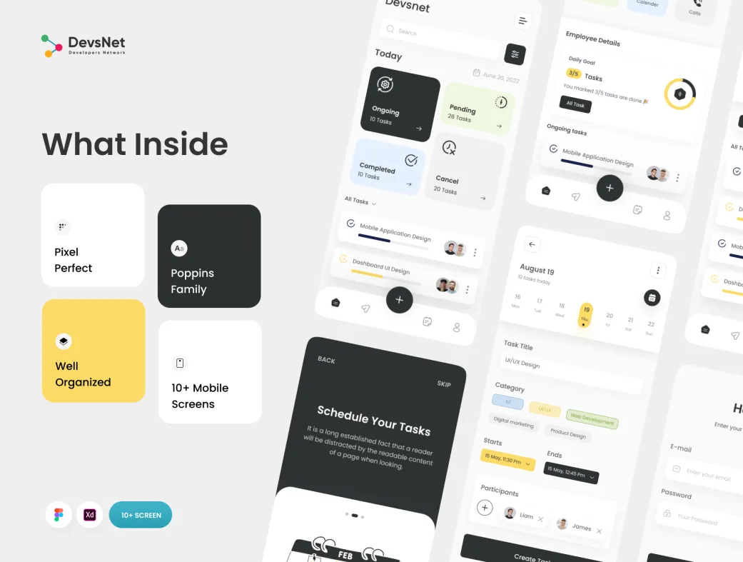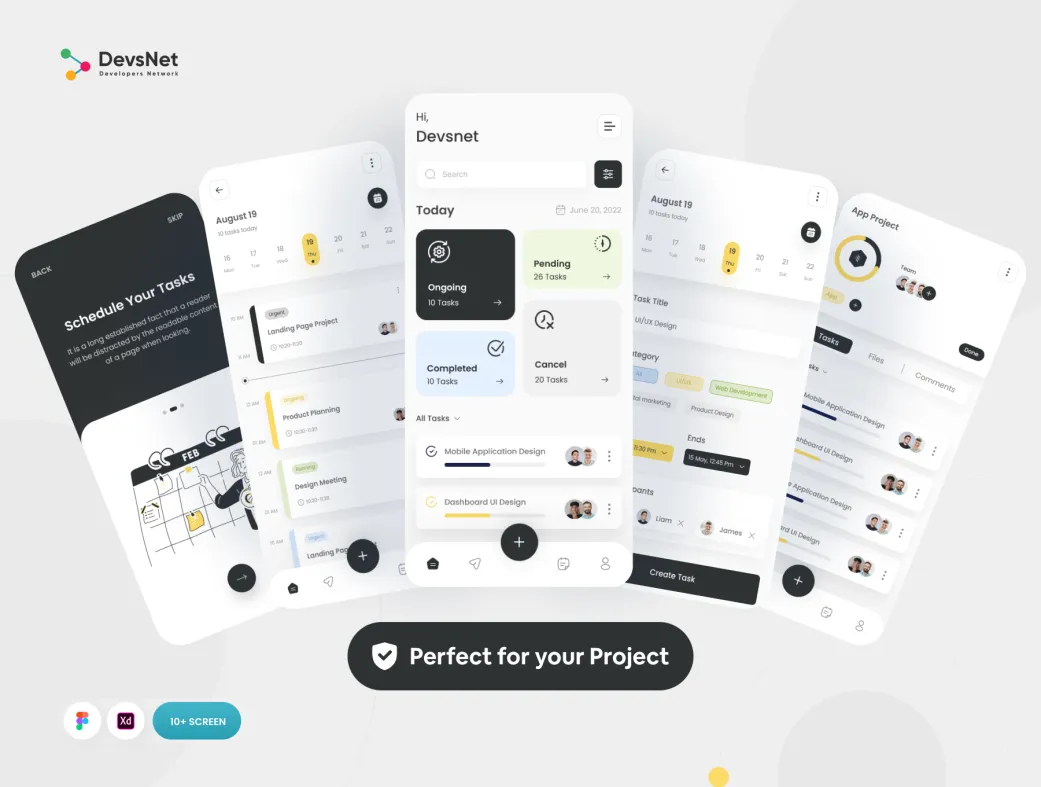 کیت شامل بیش از ۱۰ صفحه کلیدی مانند داشبورد، لیست وظایف، جزئیات تسک و تنظیمات است. تمام اجزا وکتوربیس و قابل ویرایش هستند تا با نیازهای پروژهتان تطبیق یابند. فایلهای ZIP برای فیگما و XD آماده دانلود، با حجم مناسب برای کار سریع.