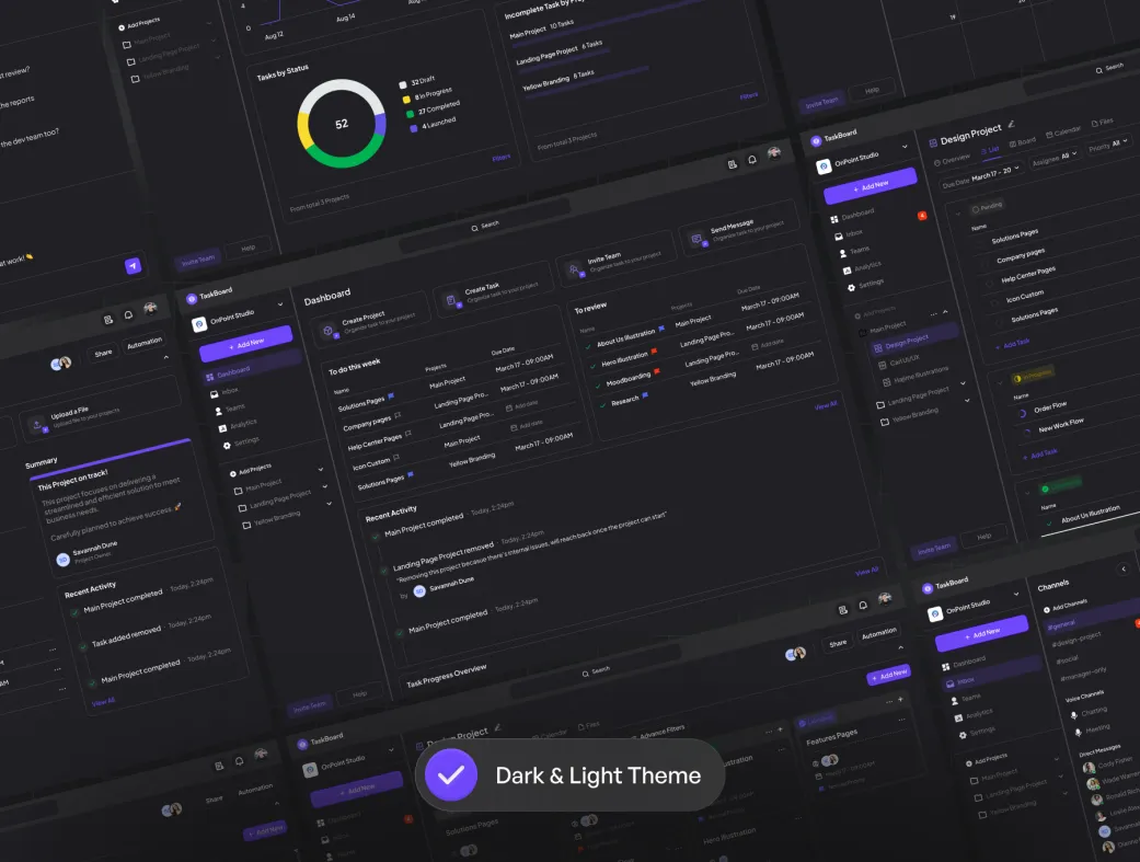 - حالت روشن و تاریک: TaskBoard در دو حالت روشن (Light Mode) و تاریک (Dark Mode) ارائه شده است تا کاربران بتوانند محیط کاری خود را بر اساس ترجیحات بصری یا شرایط نوری تنظیم کنند.
