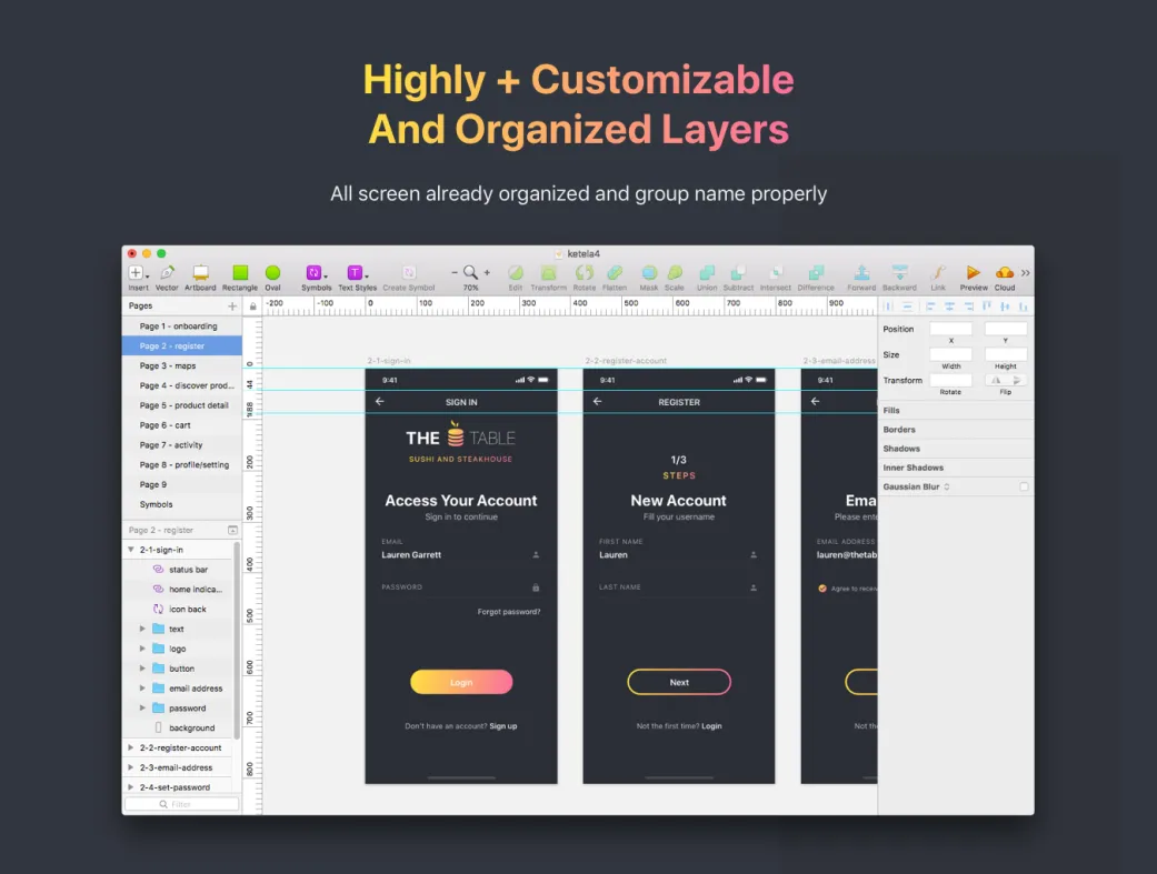 برای استفاده از کیت UI "The Table"، کافی است فایلهای مربوطه را در نرمافزار Sketch بارگذاری کرده و طراحیهای خود را بر اساس الگوهای موجود شروع کنید. هر صفحه به وضوح نامگذاری شده و دستهبندیها به آسانی قابل دسترسی هستند.