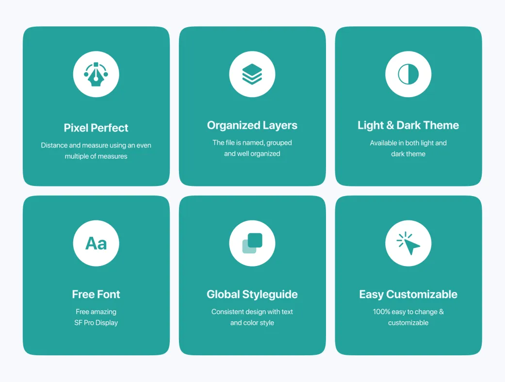 این کیت شامل بیش از 30 صفحه تمیز و مدرن است که آماده استفاده و ویرایش میباشند. طراحی جدید و جذاب با رنگهای تازه، تجربه کاربری عالی را برای کاربران فراهم میآورد. همچنین، این کیت شامل لوگو و آیکون رایگان و فونت SF Pro Display است. تمامی اجزاء این کیت بهصورت وکتوری قابل ویرایش و مقیاسپذیر هستند، به این معنی که میتوانید به راحتی هر جزء را تغییر دهید و با توجه به نیاز خود آن را شخصیسازی کنید.