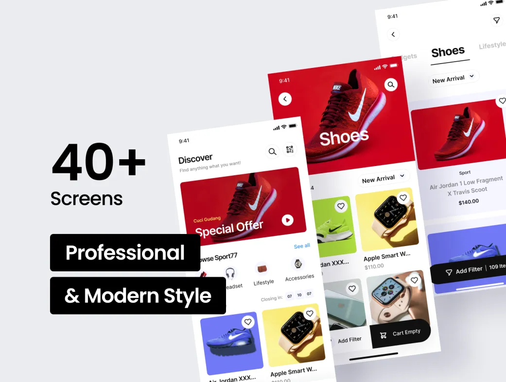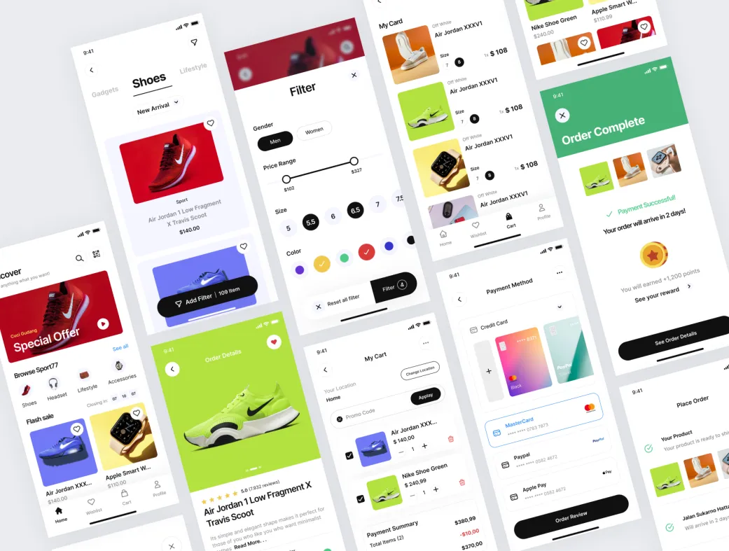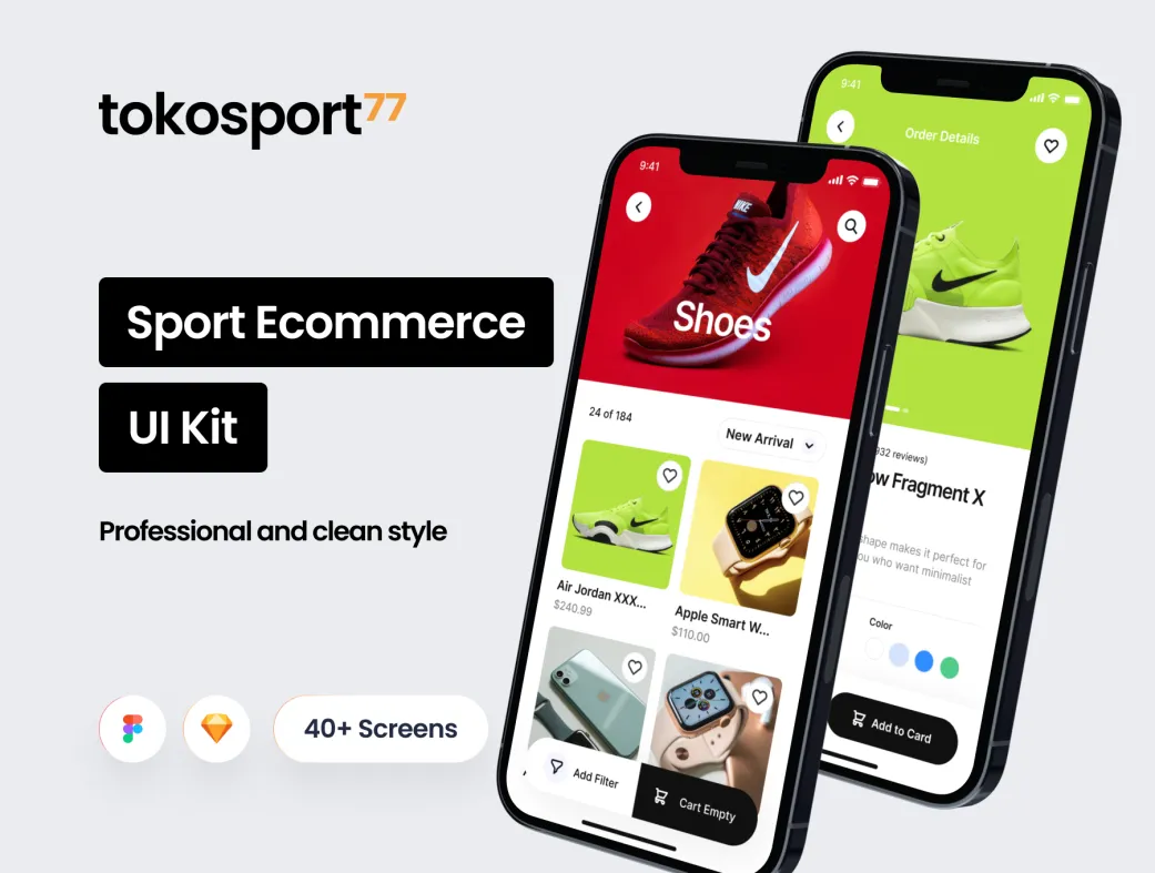 Tokosport77 یک کیت رابط کاربری حرفهای و جذاب برای اپلیکیشنهای فروشگاهی ورزشی است. این محصول با طراحی مدرن، رنگهای شاد و پرجنبوجوش، به شما کمک میکند تا یک اپلیکیشن فروش تجهیزات ورزشی، لباس ورزشی و لوازم健身 را بهسرعت طراحی و پروتوتایپ کنید.